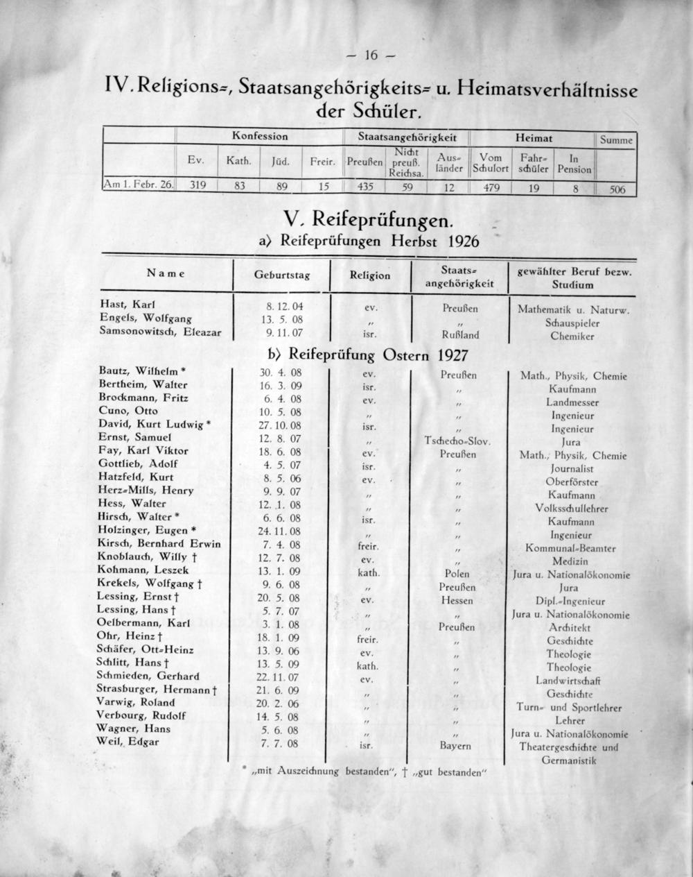 b) Reifeprüfung Ostern 1927 Bautz, Wilhelm* 30. 4. 08 ev. Preußen Math., Physik, Chemie Bertheim, Walter 16. 3. 00 isr.„ Kaufmann Brockmann, Fritz 6. 4. 08 ev.„ Landmesser Cuno, Otto 10. 5. 08„„ Ingenieur David, Kurt Ludwig* 27. 10. 08 isr. Ingenieur Ernst, Samuel 12. 8. 07 3 Ischecho-Slov. Jura Fay, Karl Viktor 18. 6. 08 ev. Preußen Math., Physik, Chemie Gottlieb, Adolf 4. 5. 07 isr.„ Journalist Hatzfeld, Kurt 8. 5. 06 ev.„ Oberförster Herz=Mills, Henry 9. 9. 07„„ Kaufmann Hess, Walter 12. 1. 08„„ Volksschullehrer Hirsch, Walter* 6. 6. 08 isr.„ Kaufmann Holzinger, Eugen* 24. 11. 08„„ Ingenieur Kirsch, Bernhard Erwin 7. 4. 08 freir.„ Kommunal⸗-Beamter Knoblauch, Willy † 12. 7. 08 ev.„ Medizin Kohmann, Leszek 13. 1. 09 kath. Polen Jura u. Nationalökonomie Krekels, Wolfgang † 9. 6. 08„ Preußen Jura Lessing, Ernst † 20. 5. 08 ev Hessen Dipl.-Ingenieur Lessing, Hans f† 5. 7. 07„„ Jura u. Nationalökonomie Oelbermann, Karl 3. 1. 08„ Preußen Architekt Ohr, Heinz † 18. 1. 00 freir.„ Geschichte Schäfer, Ott=⸗Heinz 13. 9. 06 ev.„ Theologie Schlitt, Hans † 13. 5. 00 kath.„ Theologie Schmieden, Gerhard 22. 11. 07 ev.„ Landwirtschaff Strasburger, Hermann † 21. 6. 00„„ Geschichte Varwig, Roland 20. 2. 06 Turn- und Sportlehrer Verbourg, Rudolf 14. 5. 08 Lehrer Wagner, Hans 5. 6. 08„„ Jura u. Nationalökonomie Weil, Edgar 7. 7. 08 isr. Bayern Theatergeschichte und Germanistik