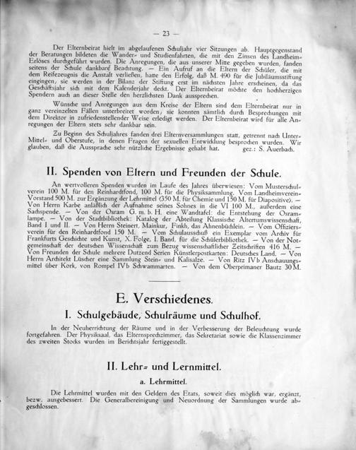 Zu Beginn des Schuljahres fanden drei Elternversammlungen staft, getrennt nach Unter- Mittel- und Oberstufe, in denen Fragen der sexuellen Entwicklung besprochen wurden. Wir glauben, daß die Nussprache sehr nützliche Ergebnisse gehabt hat. gez.: S. Xuerbach.