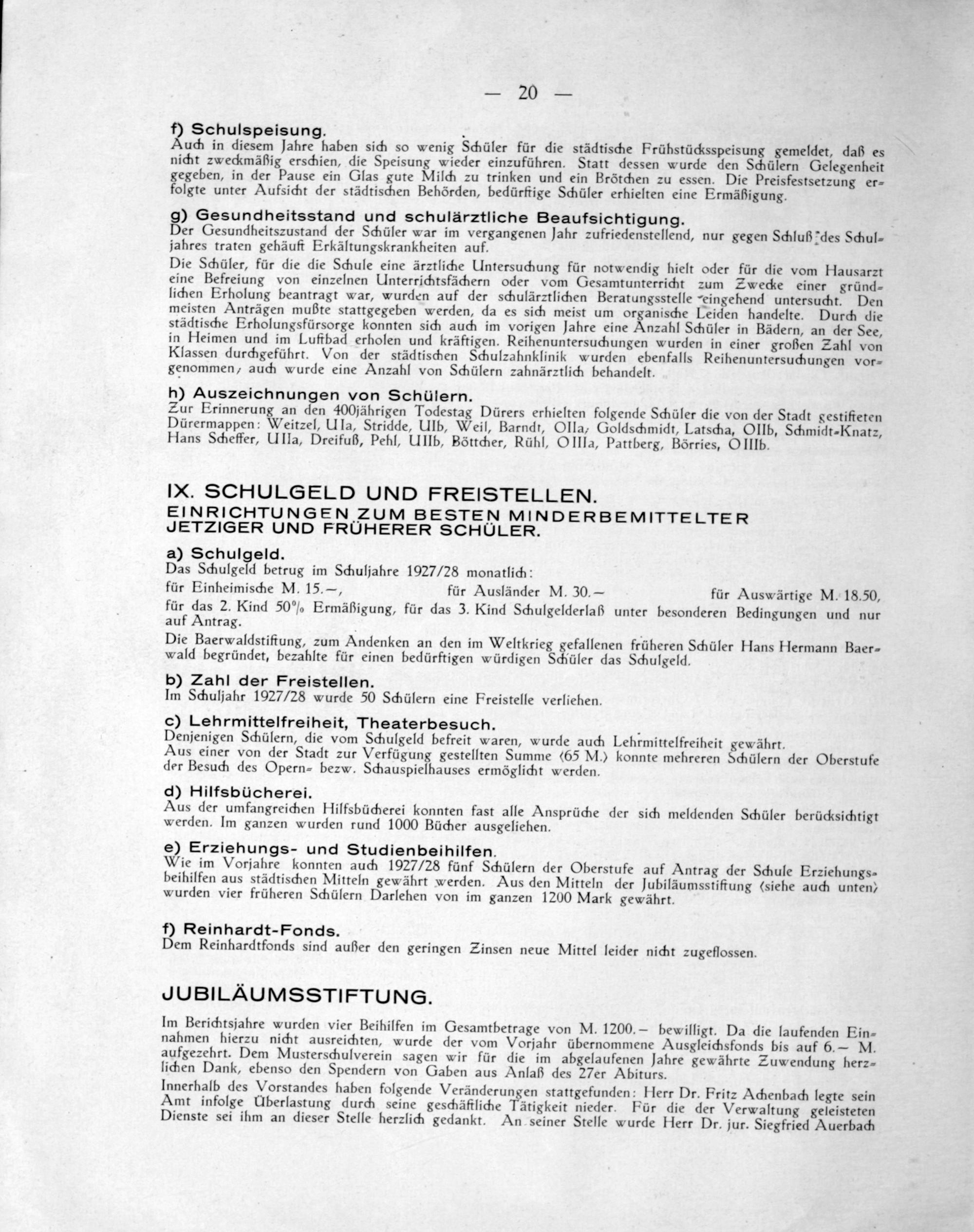Wie im Vorjahre konnten auch 1927/28 fünf Schülern der Oberstufe auf Antrag der Schule Erziehungs- beihilfen aus städtischen Mitteln gewährt werden. Aus den Mitteln der Jubiläumsstiftung(siehe auch unten, wurden vier früheren Schülern Darlehen von im Sanzen 1200 Mark gewährt.