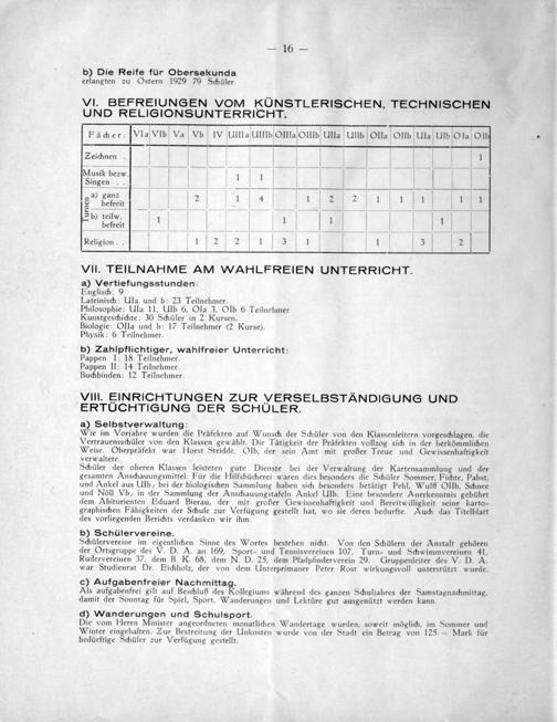 Schülervereine im eigentlichen Sinne des Wortes bestehen nicht. Von den Schülern der Anstalt gehören der Ortsgruppe des V. D. X. an 160, Sport- und Tennisvereinen 107, Turn- und Schwimmyvereinen 41, Rudervereinen 37, dem B K. 68, dem N. D. 25, dem Pfadpfinderverein 20. Gruppenleiter des V. D. A. war Studienrat Dr. Eichholz, der von dem Unterprimaner Peter Rost wirkungsvoll unterstützt wurde.
