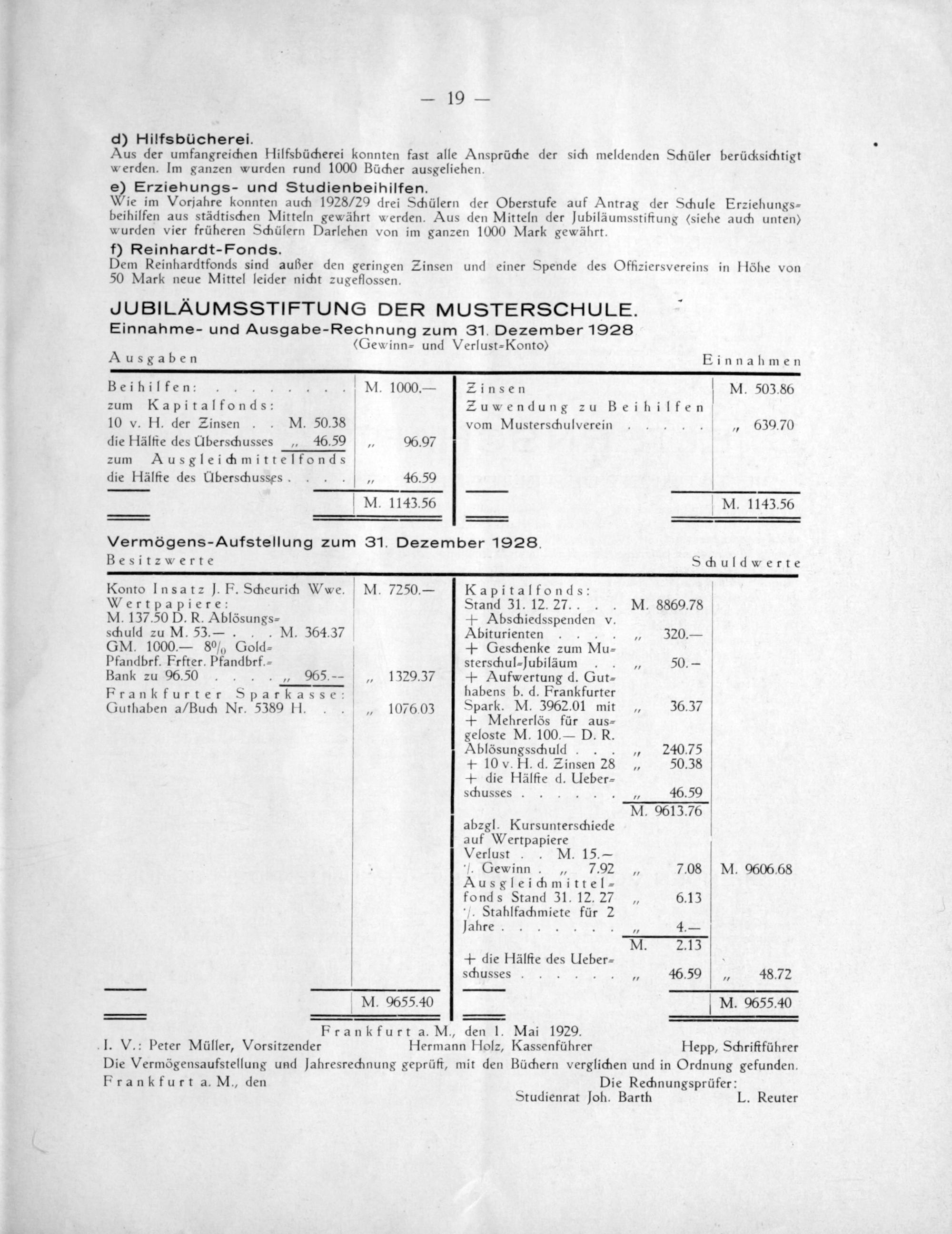 Frankfurt a. M., den 1. Mai 1929. I. V.: Peter Müller, Vorsitzender Hermann Holz, Kassenführer Hepp, Schriftführer Die Vermögensaufstellung und Jahresrechnung geprüft, mit den Büchern verglichen und in Ordnung gefunden.