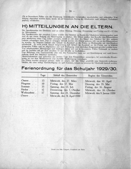 Die Sprechstunden der einzelnen Lehrer werden den Schülern zu Beginn des Schuljahres bekanntgegeben, auch sind sie aus einem Anhang am Schuleingang zu ersehen. Die Eltern wollen ihre Besuche dem Klassenlehrer stets mindestens einen Tag vorher anzeigen, damit er sich über den Stand des Schülers bei den anderen Lehrern erkundigen kann. Für 1— 2tägigen Urlaub werden die Eltern gebeten, sich nur an den Klassenlehrer zu wenden, für längeren Urlaub oder Urlaub im Anschluß an die Ferien ist Rücksprache mit dem Direktor erforderlich. Es wird jedoch darauf hingewiesen, daß Urlaub im Anschluß an die Ferien nur in wirklich dringenden Fällen und im allgemeinen nur nach Vorlegung eines ärztlichen Zeugnisses gewährt werden kann. Von telephonischen Mitteilungen und Anfragen bitten wir nur in besonderen Pällen Gebrauch zu machen und sie tunlichst auf die Zeit zwischen 11 und 12 Uhr zu beschränken.