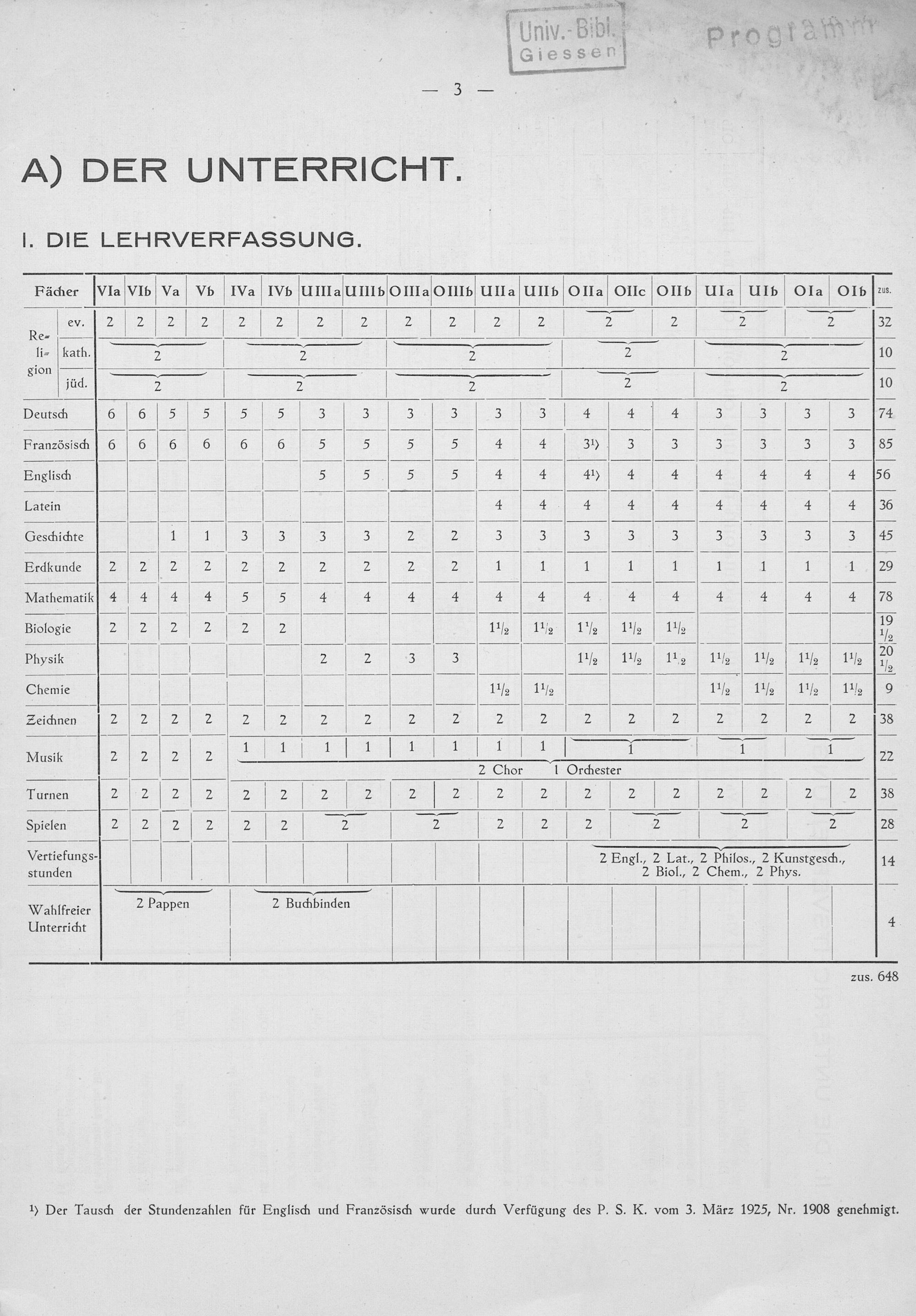 1) Der Tausch der Stundenzahlen für Englisch und Französisch wurde durch Verfügung des P. S. K. vom 3. März 1925, Nr. 1908 genehmigt.