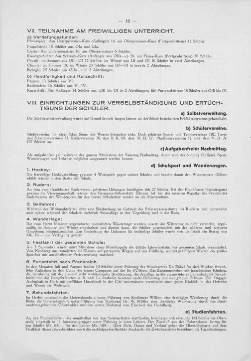 Am 3. September wurde unter Mitnahme einer Musikkapelle die übliche Jahresfestfahrt der gesamten Schule veranstaltet. Von Kronbers aus wanderten die Klassen auf getrennten Wegen auf den Feldberg, wo bei prächtigem Wetter ein großes Sportfest mit anschließender Preisverteilung stattfand.