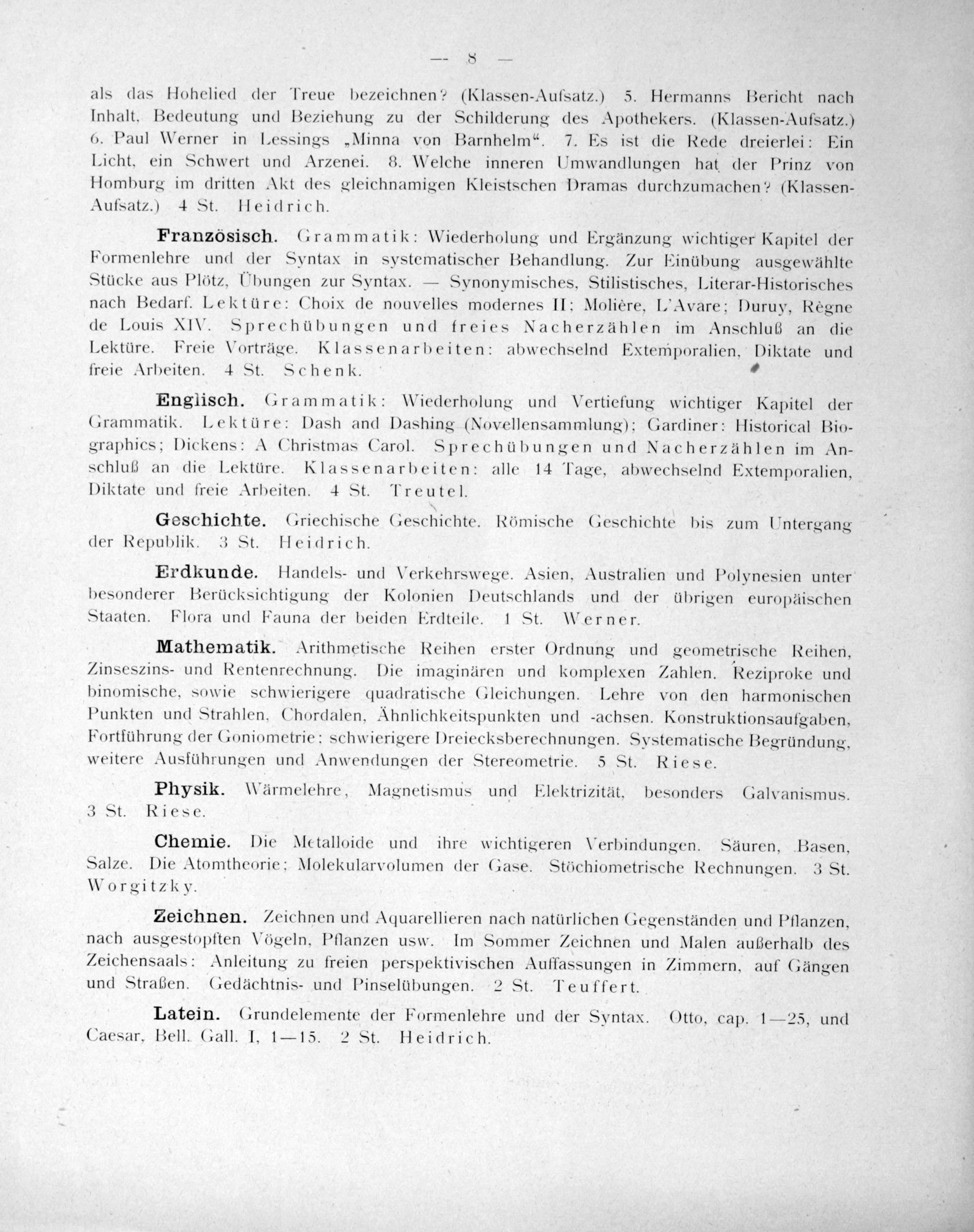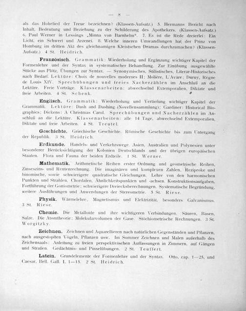 als das Hohelied der Treue bezeichnen?(Klassen-Aufsatz.) 5. Hermanns Bericht nach Inhalt, Bedeutung und Beziehung zu der Schilderung des Apothekers.(Klassen-Aufsatz.) 6. Paul Werner in Lessings„Minna von Barnhelm“. 7. Es ist die Rede dreierlei: Ein Licht, ein Schwert und Arzenei. 8. Welche inneren Umwandlungen hat der Prinz von Homburg im dritten Akt des gleichnamigen Kleistschen Dramas durchzumachen?(Klassen- Aufsatz.) 4 St. Heidrich.