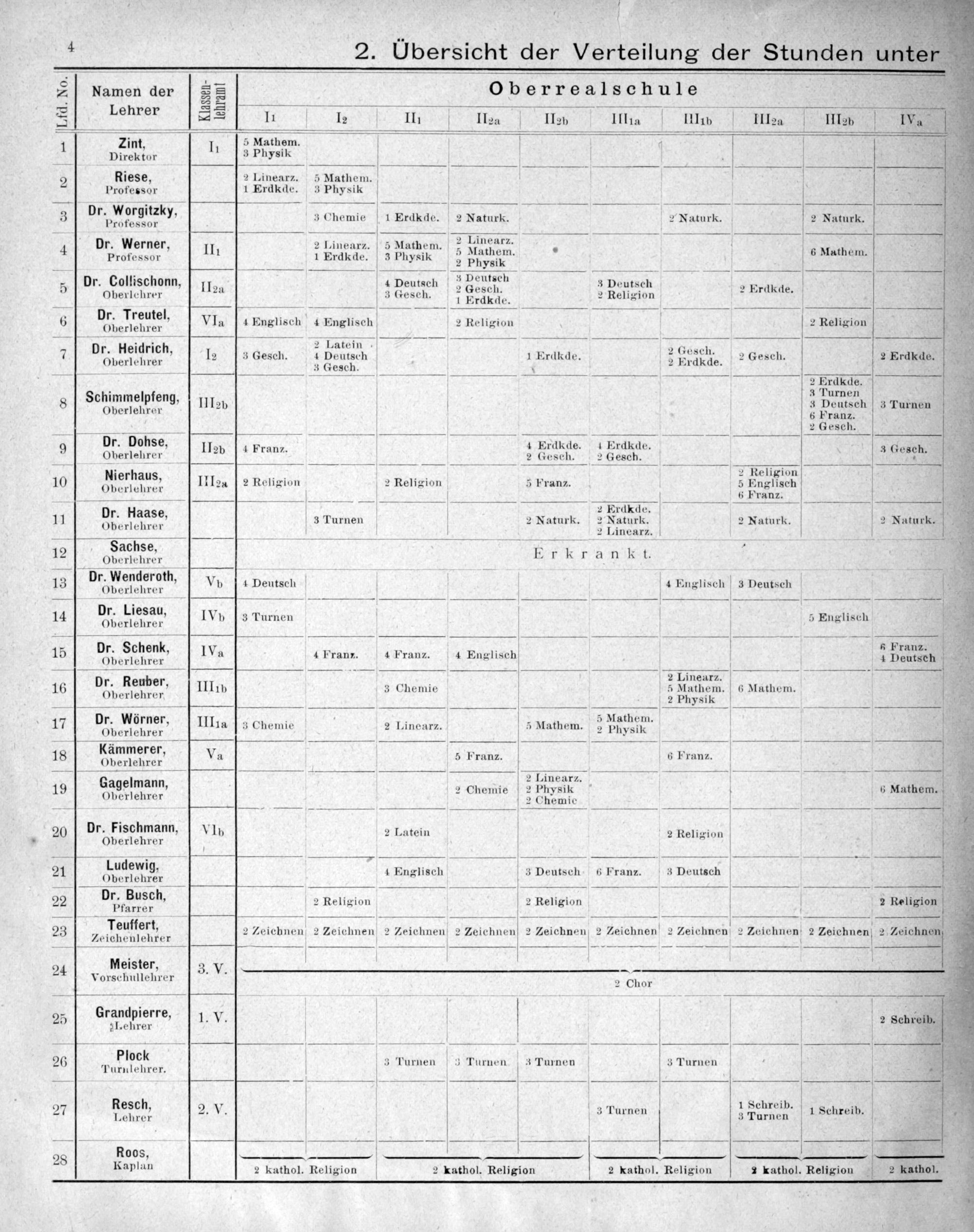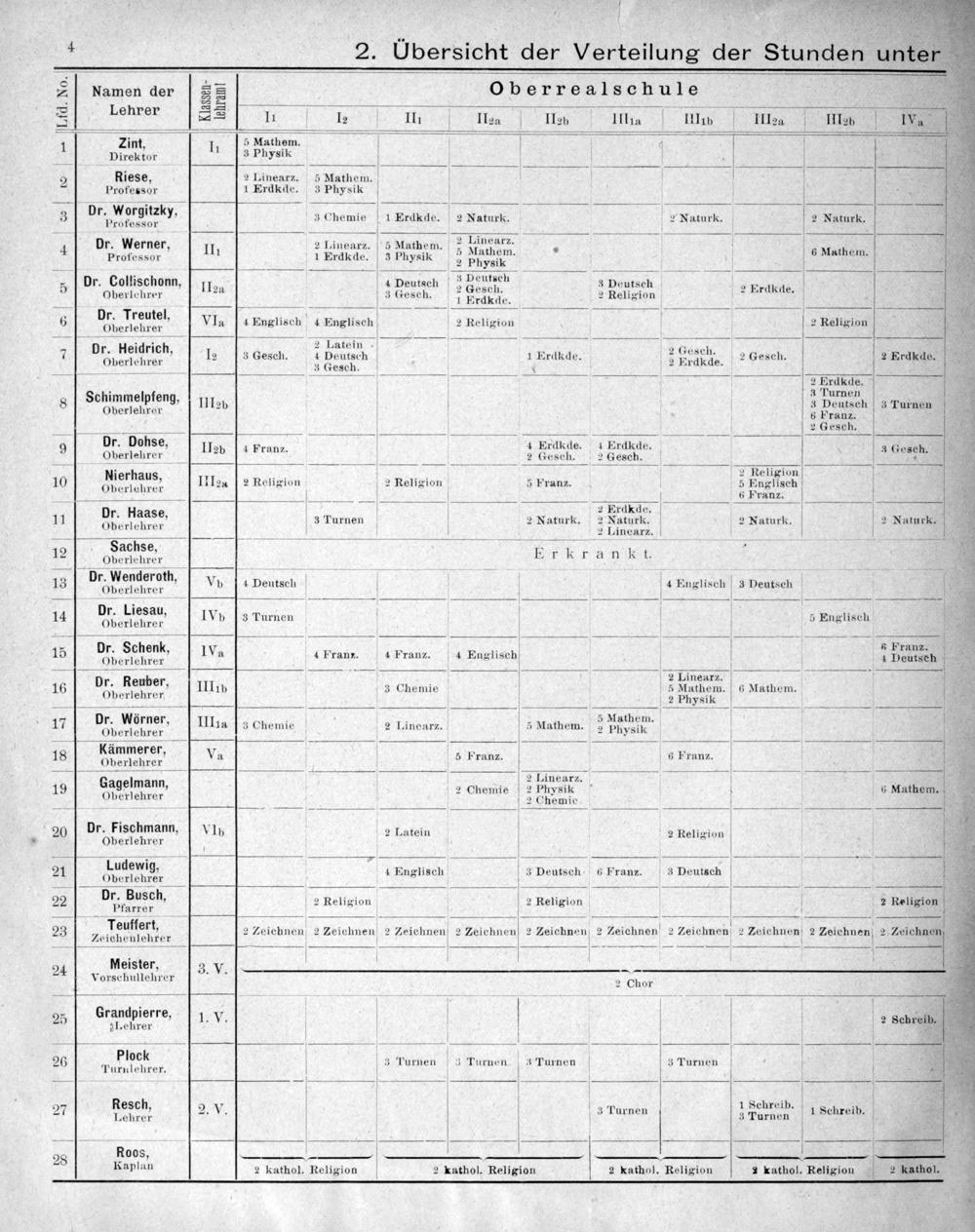 4 8—7. 1 4 1 2. Ubersicht der Verteilung der Stunden S 6— 3 S Namen der.= Oberrealschule . Lehrer ö ſ* S S2 11 12 II Ilaa IIZb IIlia llI lIIga III 1— F 1 Zint 1 5 Mathem. 1 Direktor 13 Physik . 2 Riese, 2 Linearz. 5 Mathem. 5 Professor 1 Erdkde. 3 Physik 6 3 Dr Norgſtety. 3 Chemie 1 Erdkde. 2 Naturk. ² Naturk. 2 Nuturk. 3 3 Dhr. Werner 2 Linearz. 5 Mathem. 2 Hinearz. 4 Professor 4 II 1 Erdkde. 3 Physik 3 Narharn. 4 6 Mathenn. 8 Dr. Collischonn Deutsch ³ Deutsch 8e 3 Deutsch— 5 Ooberlchrer II2a 3 Gesch 2 Kesch. 2 Religion 2 Erdkde. 6 De Teeuteb. VIa[4 Englisch 4 Englisch 2 Religion 2 Rellgion Dr. Heidrich 2 Latein. 1 2 Gesch.. 7 Oberlehrer“ l. 3 Gesch. 4 Dentach 1 Erdkde. 2 Erdkde. ² Gesch. 2 Erdkde. ——— 3 Gesch. 4 G 2 PrdEdo. himmelpfeng à Turnen 1 3 8 Sc ng, IIIeb 3 Deutsch 3 Turnen Oberlehrer 6 FrAte. 2 Gesch. 5 Dr. Dohse, 4 Erdkde. ¹ Erdkde 3 4 Oberlehrer Irane. 2 Gesch. 2 Gesch. 4 Gesch. i 2 Religion 1— 10 Nierhaus, III2a 2 Religion 2 Religion 5 Franz. 5 Englisch Oberlehrer Hng —— 6 Franz. 2 Erdkde. 11 Dr. Haase, 3 Turnen 2 Naturk. 2 Naturk. V 2 Naturk. 2 Naturk. Oberlehrer 2 Linearz. 12 Schee 1r n 1 Oberlehrer 4 3. 3 2 Dr. Wenderoth 3 5— 3 2 i 3 13 Oberlehrer 2 Vb[DPeutsch V 4 Englisch 3 Deutsch V 14 Dee diesau, IVb s Turnen 5 Englisch Dr. Schenk 8 aa pranz. 15 Oberlehrer' 1Va 4 Praur. 4 Prämg. 4 Pna isch Deutsch 2 Linearz. 16 vr. Reuber, IIII 3 Chemie 5 Mathem. V 6 Mathem. berlehrer 2 Physik 8 Dr. Wörner III.:— 5 Mathem. 8 5 1 3 C 5 Linearz. 52 m. j 8 17 Oberlehrer 213 Chemie 2 Linear⸗ 5 Mathem. 2 Physik 1 Kämmerer 3 18 Oberlehrer' Va 5 Franz. 6 Franz. V Gagelmann, 2 Pineara. 19 Otürlehrer 2 Chemie 4 PiTalhe 6 Mathem. 20 Dr. Fischmann, VIH 2 Latein 2 Religion Oberlehrer 2 2 Ludewig 8 gli 3 Sch. 6 F 3 De 21 Oberlehrer 4 Englisch 3 Deutsch 6 Franz. 3 Deutsch V 3 22 Dr. Husch, ⸗ Religion eReligion 2 Religion 9 3] feuffert, 75 1, 2 2, G„— e 23 Zeichenlehter 2 Zeichnen 2 Zeichnen 2 Zeiehneu 2 Zeichnen 2 Zeichnen] 2 Zeichnen 2 Zeichnen 2 Zeichnen 2 Eoiohmen 2 Zeichne 2 3 —* Srer j 24 Meister, 3. V Vorschullehrer 2 Chor 5Granqdpierre 25 I.ehrer 2 1. V. 26* Plock 3 Turnen 3 Turnen 3 Turnen 3 Turnen Purnlehrer. 8 3 V b Resch 9 V„ 1 Schreib. 27 Lehrer 2. V. 3 Turnen 3 Turnen 1 Schreib. 28 Roos, 5 Kaplan 2 kathol. Religion 2 kathol. Religion 2 kathol. Religion 2 kathol. Religion