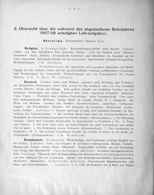 Französisch. Grammatik: Wiederholung und Ergânzung wichtiger Kapitel aus der Syntax. Lektüre: Taine, Les Origines de la France contemporaine; Molière, Tartuffe; Maupassant, Contes choisis(Paris, Ollendort). Ausgewählte Gedichte aus der Sammlung von Gropp und Hausknecht. Sprechübungen und freie, besonders literaturgeschicht- liche Vorträge. Obersicht über die Entwicklung der französischen Literaturgeschichte von den Anfängen bis zur Gegenwart. Sprach- und Kulturgeschichtliches, Synonymisches. Metrisches, Stilistisches. Schriftliche Arbeiten: Abwechselnd Klassenarbeiten und Haus- und Klassenaufsätze.— Aufsätze: 1. La Ville de Francfort sur le Mein aux Temps