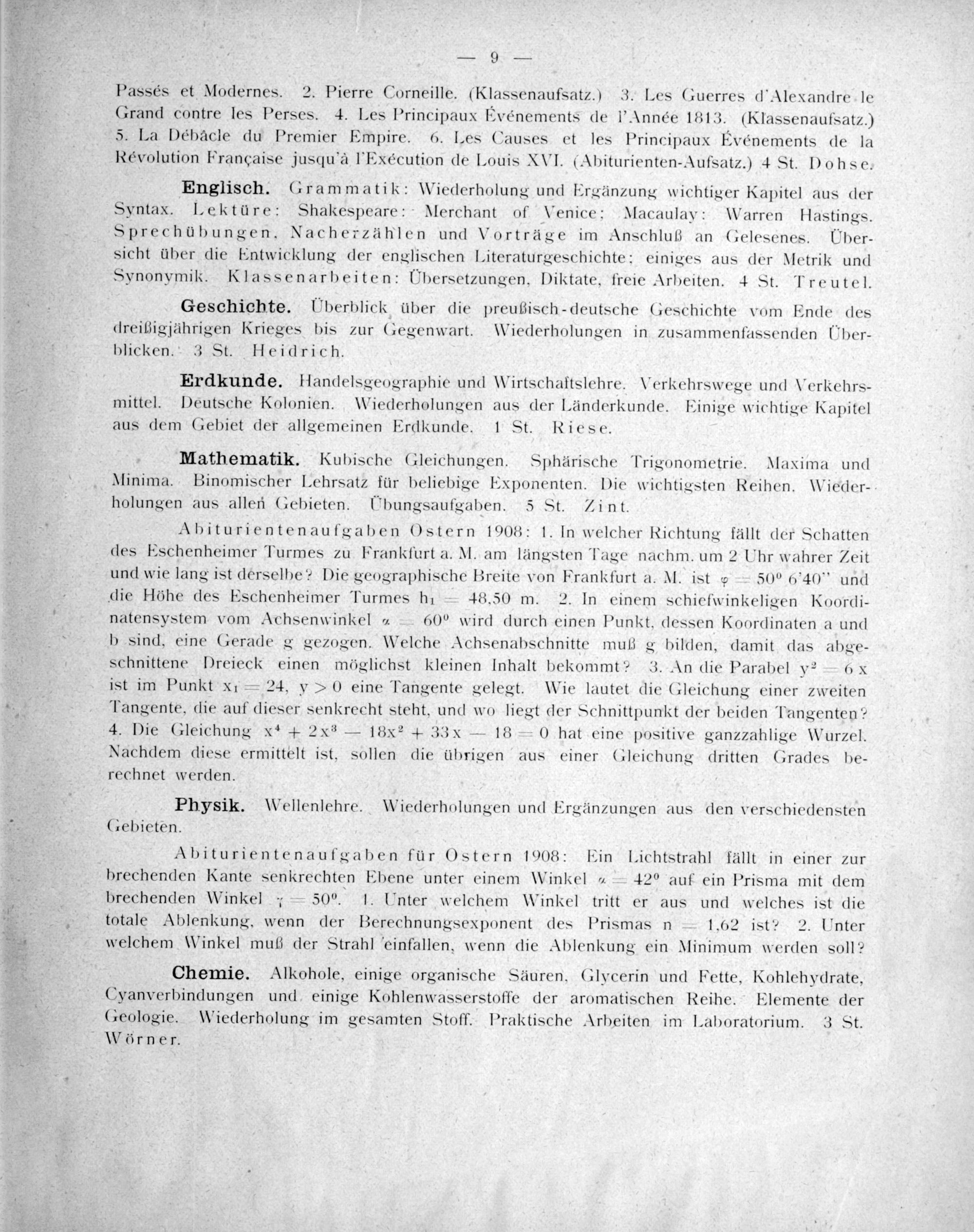Passés et Modernes. 2. Pierre Corneille.(Klassenaufsatz.) 3. Les Guerres d'Alexandre le Grand contre les Perses. 4. Les Principaux Evénements de l'Année 1813.(Klassenaufsatz.) 5. La Débacle du Premier Empire. 6. Les Causes et les Principaux Evénements de la Révolution Française jusqu'à l'Exécution de Louis XVI.(Abiturienten-Aufsatz.) 4 St. Dohse.
