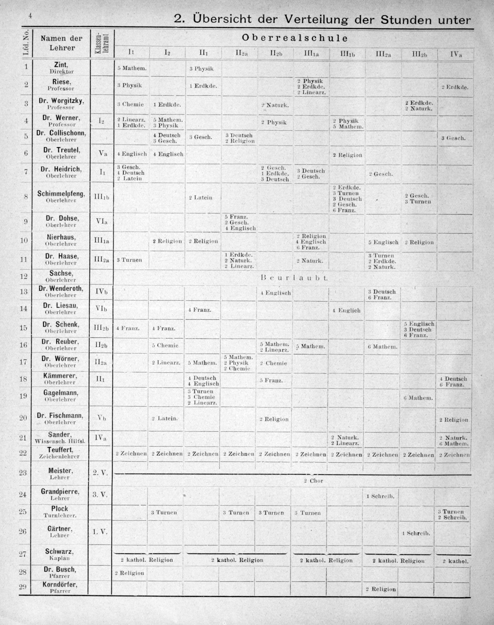 S— Namen der[.˖ Oberrealschule S Lehrer Sö= 8 5 SZ 11 12 II2a II2b IIlia IIII IIIaA IHle lIVa 1 Zint, 5 M= Direktar à Mathem. 3 ö“ 2 Physik 2 Riese, 3 Physik 1 Erdkde. 2 Prdkde. 2 Erdkde. Professor 2 Linearz. ———— Dr. Worgitzky ahen“ 4 2 Erdkde. 3 Profosor* 3 Chemie 1 Erdkde. 2 Naturk. 2 Naturk. Dr. Werner 1 2 Linearz. 5 Mathem 5 2 Physik .. inearz. 7. 2 vsik 2 vVsik 4 Professor 2 1 Erdkde. 3 Physik PbNdjb 5 Mathem. „ br. Collischonn, 4 Deutsch 3 Ges 3 Deutsch 1 5 Oberlehrer 3 Gesch. 3 Gesch. 2 Religion 3 Gesch. b 3 Dr. Treutel 3. 8 1 6 Oherlehrer Va[4 Englisch 4 Englisch 2 Religion . ri 3 Gesch. 2 Gesch.—. 1 7 Dr. Heidrich, I1 1 Deutsch 1 Erdkde. 3 Peutsch 2 Gesch. Oberlehrer 2 Latein 3 Peutsch 2 Gesch. 2 Erdkde. Schimmelpfeng, 3 Turnen 2 Gesch. 8 Oberlehrer IIIn 2 Lutein 4 Peufsch 1 3 Turnen b .——(6 Franz. Dr. Dohse„ 5 Franz. 9 8, VIa 2 Gesch. 5 Oberlehrer 4 4 Englisch Nierhaus 2Religion 10; IIIia 2 Religion 2 Religion 4 Englisch 5 Englisch ² Religion 1 Oberlehrer 6 Franz. . ne. 3 1 Erdkde. 3 furnen 11 Dr. laase, III2a 3 Turnen 2 Naturk. 2 Naturk. 2 Erdkde. V Sberlehrel 1 2 Linearz. 2 Naturk. 9 Sachse, 12 Oberlehrer Beurlaubt. . ¹ 13] Dr. Wenderoth. IVp 4 Englisch 3 Deutsch — Oberlehrer. 6 Franz. Dr. Liesau, 14 Oberiehrer VIb Franz. 4 Euglich —————————— 5 Englisch 15 Dr. Schenk, III2b[4 Franz. 4 Franz. 3 Deut ch en Umer 6 Franz. Dhr. Reuber. 5 Mathenn 16 Oberlehrer IIb 5 Chemie 5 LinGadn. 5 Mathem. 6 Mathem. girnge SüS 5 Mathem. 5 ö 17 Dr. Mörner, II2a 2 Linearz. 5 Mathem. 2 Physik 2 Chemie ten 5———— ²Chemie 1 ämmerer, Deutsch 3 FrA 1 Deutsch 18[berlehrer Ili V 4 Englisch 5 Fran. 6 Franz. 3 Turnen— 19 Gahelmann, 3 Chemie 6 Mathem. derlehrer 2 Trenmre. 3 1 20 Dr. Fischmann, Vp 2 Latein. 2 Religion 2 Religion Oberlehrer .———. 21 8 Sander, 3 IVa V 2 Naturk. 2 Naturk. —Wissensch. IIilfsl.— 4 2 Linearz. 6 Mathem. 1 22 2 leuffert,. 2 Zeichnen 2 Zeichnen 2 Zeichnen] 2 Zeichnen 2 Zeichnen 2 Zeichnen 2 Zeichnen 2 Zeichnen 2² Leichnen 2 Zeichnen zeichenlehre“ 1 23 Meister, 2. V. 5 Lehrer 2 Chor ——— 24 Grandnierre, 3. V.* 1 Schreib. 8—— 95 Plock 3 Turne 3 ene rne 3 Tur 13 Turnen 25 Purnlehrer. 3 Turnen 3 Turnen 3 Turnen 3 Turnen 2 Schreib. — 88 26 Cartner, 1. V.. 1 Schreib. Chrer. V V V V 27 Schwarz, 8 Kaplan 2 kathol. Religion 2 kathol. Religion 2 kathol. Religion 2 kathol. Religion 2 kuthol. —————————— 28 Dr. Busch, 2 Religion 93 Pfarrer 5. S 9 Korndörfer, 58 2 Pfarrer 2 Religion