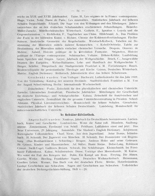 reichs im XVII. und XVIII. Jahrhundert. Taine. H., Les origines de la France contemporaine. Hugo. Victor, Notre Dame de Paris: Les misérables. Statistisches Jahrbuch der höheren Schulen Deutschlands. Edzardi, Die Sage von den Wölsungen und den Nibelungen. Jahres- verzeichnis der an den deutschen Schulanstalten erschienenen Abhandlungen. Benecke- Müller-Zarncke, Mittelhochdeutsches Wörterbuch. Gothein, E., Ignatius v. Loyola und die Gegenreformation. v. Richthofen, F., Tagebücher aus China. Hildebrand, A., Das Problem der Form in der bildenden Kunst. v. Richter, Chemie der Kohlenstoffverbindungen. Fiedler- Salmon. Analytische Geometrie der Kegelschnitte. Weisbach-Kolbeck, Tabellen zur Be- stimmung der Mineralien mittels äußerer Kennzeichen. v. Kobell-Oebbeke, Tafeln zur Bestimmuug der Mineralien mittels einfacher chemischer Versuche. Despois. Oeuvres de Molièére. Aulard. Histoire politique de la Kévolution Française. Seignobos, Histoire politique de l'Europe contemporaine. Schirmacher, Voltaire. Böhme-Köhler, Lautbildung beim Sprechen und Singen. Geyer. Jahrbuch der Weltgeschichte. Bruch, C., Ausgewählte Dramen des Euripides. Weber-Baldamus, Lehr- und Handhuch der Weltgeschichte V. Berger. Schiller. Bürgerbuch der Stadtgemeinde Frankfurt a. M. Fortsetzungen: Hauck. Realencvclopädie für protestantische Theologie und Kirche. Grimm, Deutsches Wörterbuch. Murrav, English Dictionarvy. Rethwisch. Jahresbericht über das höhere Schulwesen.