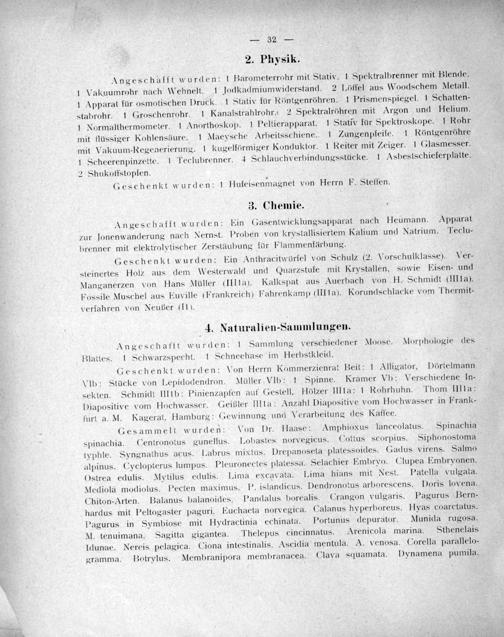 Geschenkt wurden: Von Herrn Kommerzienrat Beit: 1 Alligator, Dörtelmann VIb: Stücke von Lepidodendron. Müller VIb: 1 Spinne. Kramer Vb: Verschiedene In- sekten. Schmidt IIIIb: Pinienzapfen auf Gestell. Hölzer IIIta: 1 Rohrhuhn. Thom IIIla: Diapositive vom Hochwasser. Geißler IIIta: Anzahl Diapositive vom Hochwasser in Frank- furt a. M. Kagerat. Hamburg: Gewinnung und Verarbeitung des Kaffee.