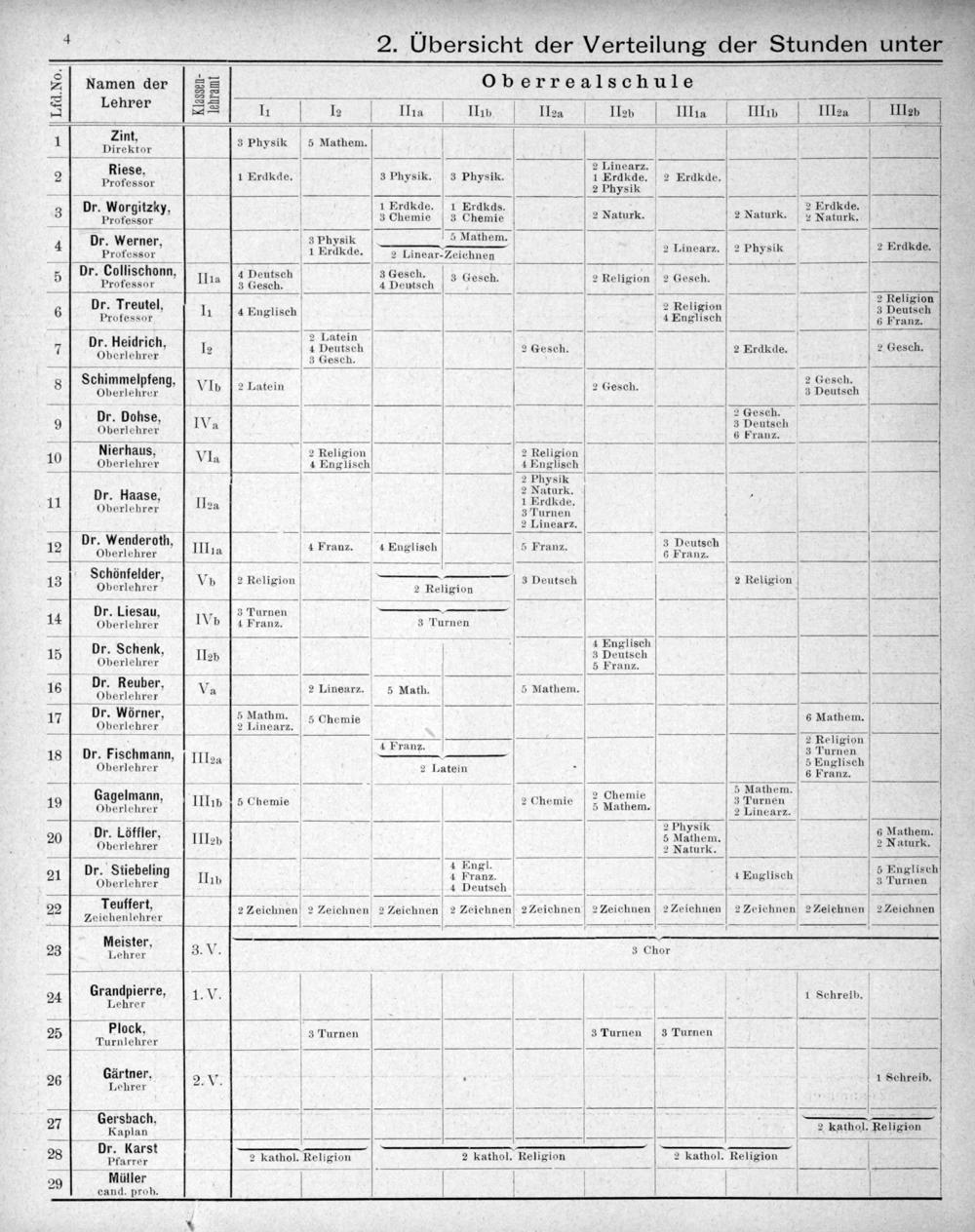 55„* d 4 2.. 8 9 2. UÜbersicht der Verteilung der Stunden unter 2]Namen der.˖ Oberrealschule ₰½ 2,8S S Lehrer 6 =I i i lan Ile le li llee LIIen Zint 1 Pirektor 3 Physik 5 Mathem. 5 2 Linearz. 2 rineder 1 Erdkde. 3 Physik. 3 Physik. 1 Erdkde. 2 Erdkde. ——— 2 Physik Dr. Worgitzk ¹ Erdkde. 1 Erdkds. 2 Erdkde. 3 Tneren⸗ 3 3 Chemie 3 Chemie 2 Naturk. 2 Naturk. 2 Naturk. Dr. Werner Physik Mathem. r. 4 Professor“ 1 Erdkde. 2 Linear-Zeichnen 2 Linearz. 2 Physik 2 Erdkde. Dr. Collischonn, Deutsch osch.— 5 ProfessorlIlia 3 Gesch. 4 Deutsch ³ Gesch. ²2 Religion 2 Gesch. Dr. Treutel, 2 Religi 2 Religion 3 2 gion 6 Professor II ſ[4 Englisch 4 Englisch 4 Penioeh —— H+— Dr. Heidrich 2 Latein 7„nns I2 4 Deutsch 2 Gesch. 2 Erdkde. 2 Gesch. Oberlehrer 3 Gesch. Schimmelpfeng. 2 Gesch. 8 Oberlehrer“ VID 2 Latein 2 Gesch. 3 Deutsch Dr. Dohse 3 2 Gesch. 9 Oberlehrer IVa 3 Deutsch —— 6 Franz. Nierhaus, 3 2 Religi en 4 gion 2 Religion 10 berlehrer VI. 4 Englisch 4 Englisch 2 Physik Dr. Haase 2 Naturk. 11 Oberlehrer II2a 1 Prdhas: V 1— 2 Linearz. Dr. Wenderoth— 3 Deutsch 12 Oberlehrer“ IIIIa 4 Franz. 4 Englisch 5 Franz. 6 Tran. Schönfelder 3 Lin 13 Enomeiccr, Vp Religion 2Roligion 3 Deutsch 2 Religion Dr. Liesau 7 3 Turnen— 14 Oberlehrer IVb 1 Franz. 3 Turnen 5 4 Englisch 15 De. Sonend. II2b V 3 Deutsch dexlehrer 5 Franz. Dr. Reuber, v. 16 Oberlehrer! Va 2 Linearz. 5 Math. 5 Mathem. 17 Dr. Wörner, 5 Mathm. 5 Chemie 6 Mathem. — Oberlehrer 2 Linearz. 8 2 Religion . 4 Franz. 18] Dr. Fischmann, IIlza LAn 3 Turnen Oberlehrer* 2 Latein. 3 Pnenisch Gagelmann, A„Cbenie 2 Chemie 5 Mathem. 19 Oberlehrer lllm 5 Chemie 2 Chemie 2 Mthum. ³ Turnen V Dr. Löffler, 2 Physik 6 Mathem. 20 Oberlehrer Il- 5 Mälhorn. 2 Naturk. Dr. Stiebeling 4 Engl.. 5 Englisch 21 Oberlehrer IIib 4 Drana. 4 Englisch 3 Turnen ———— 22 Teuffert, 2 Zeichnen 2 Zeichnen 2 Zeichnen 2 Zeichnen 2 Zeichnen 2 Zeichnen 2 Zeichnen 2 Zeichnen 2 Zeichnen 2 Zeichnen Zeichenlehrer — ecnenenrer. Meister 2 V 23 Lehrer 3. V. 3 Chor IlGrandwerce. d. 4 ſ 24 Grandylerre, 1. V. 1 Schreib. — ——— 25 mleoh, 3 Turnen 3 Turnen 3 Turnen 22]— V 26 Cartner. 2. V.. 1 Sehreib. — ———— Gersbach— 27 Kaplan W I 2 kathol. Religion 2a] vDr. Karst— 28 Pfarre 2 kathol. Religion 2 kathol. Religion 2 kathol. Religion Pfarrer————— 3 29 Müller cand. prob.