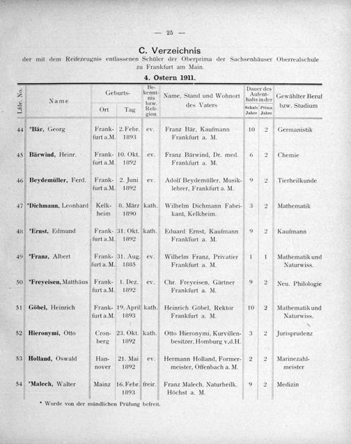 C. Verzeichnis der mit dem Reitfezeugnis entlassenen Schüler der Oberprima der Sachsenhäuser Oberrealschule zu Frankfurt am Main.