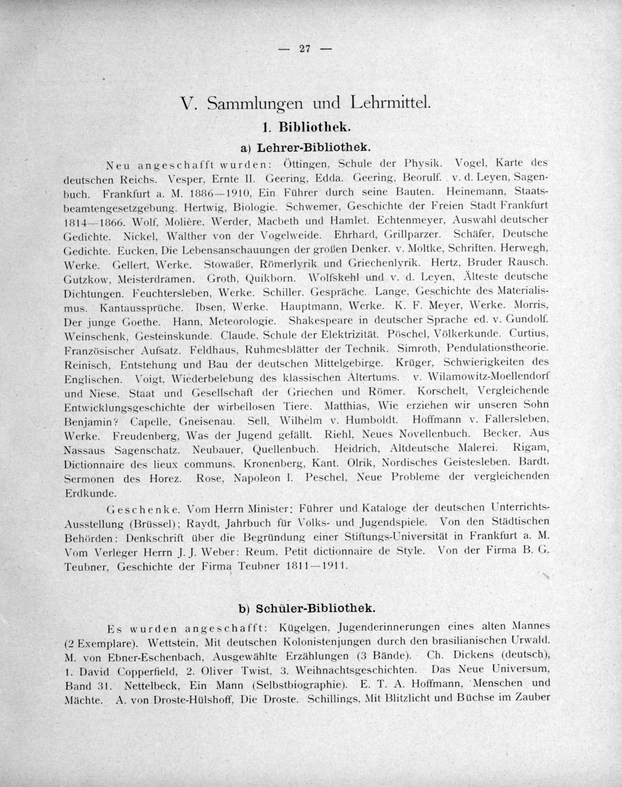 Geschenke. Vom Herrn Minister: Führer und Kataloge der deutschen Unterrichts- Ausstellung(Brüssel); Raydt, Jahrbuch für Volks- und Jugendspiele. Von den Städtischen Behörden: Denkschrift über die Begründung einer Stiftungs-Universität in Frankfurt a. M. Vom Verleger Herrn J. J. Weber: Reum, Petit dictionnaire de Style. Von der Firma B. G. Teubner, Geschichte der Firma Teubner 1811— 1911.