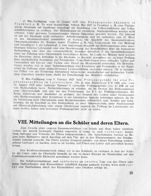 e) Min.-Verfügung vom 18. Januar 1927 betr. Pädagogische Akademie in Frankfurt a. M. Es wird beabsichtigt, Anfang Mai 1927 in Frankfurt a. M. eine Pädago- gische Akademie auf simultaner Grundlage zur Ausbildung von Volksschullehrern und Volks- schullehrerinnen zu eröffnen. Der Bildungsgang ist zweijährig. Studiengebühren werden nicht erhoben. Unter gewissen Voraussetzungen können Stipendien gewährt werden. Fin Internat ist mit der Akademie nicht verbunden. Aufnahmegesuche sind bis spätestens zum 15. Mär⸗ an den Akademiedirektor unmittelbar zu richten. Die Anschrift des Akademiedirektors, Oberstudiendirektor Dr. Weimer, lautet: Frankfurt a. M.-Süd, Textorstraße 104. Der Meldung sind beizufügen: 1. ein Lebenslauf, 2. eine beglaubigte Abschrift des Reifezeugnisses einer neun- klassigen höheren Lehranstalt oder eine Bescheinigung des Anstaltsleiters über die bestandene Reifeprüfung oder über das voraussichtliche Bestehen derselben, 3. ein Gesundheitszeugnis eines zur Führung eines Dienstsiegels berechtigten Arztes. Im Laufe des Monats April werden die Bewerber, deren Aufnahme in die Akademie in Aussicht genommen ist, zu einer Prüfung ihrer musikalischen Kenntnisse und Fertigkeiten(Vom-Blatt-Singen eines einfachen Liedes und Vertrautheit mit Klavier oder Violine oder Orgel) am Akademieort einberufen. Die Bewerbe- rinnen werden sich in einer Aufnahmeprüfung über Kenntnisse und Fertigkeiten in der Nadel- arbeit im Umfange einer abgeschlossenen Lyzeumsbildung ausweisen müssen. Ob in besonde— ren Fällen von der Forderung hinreichend turnerischer, musikalischer und technischer Vorbil- dung abgesehen werden kann, bleibt der Entscheidung des Ministers vorbehalten.