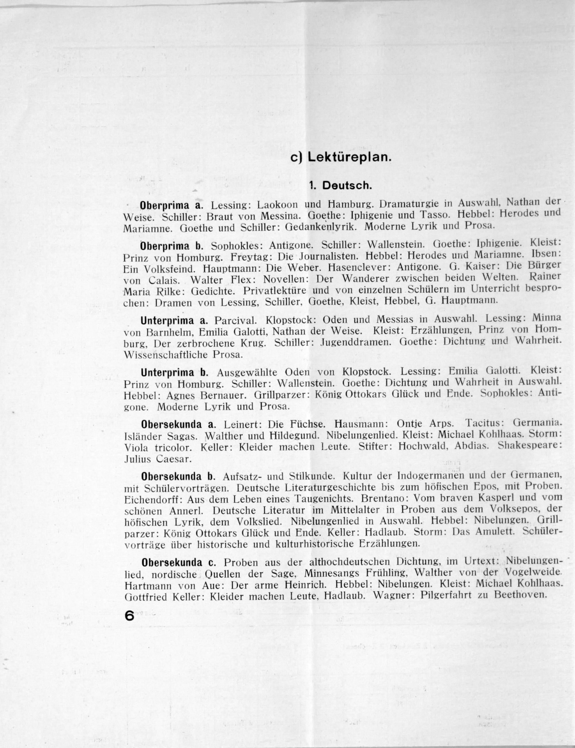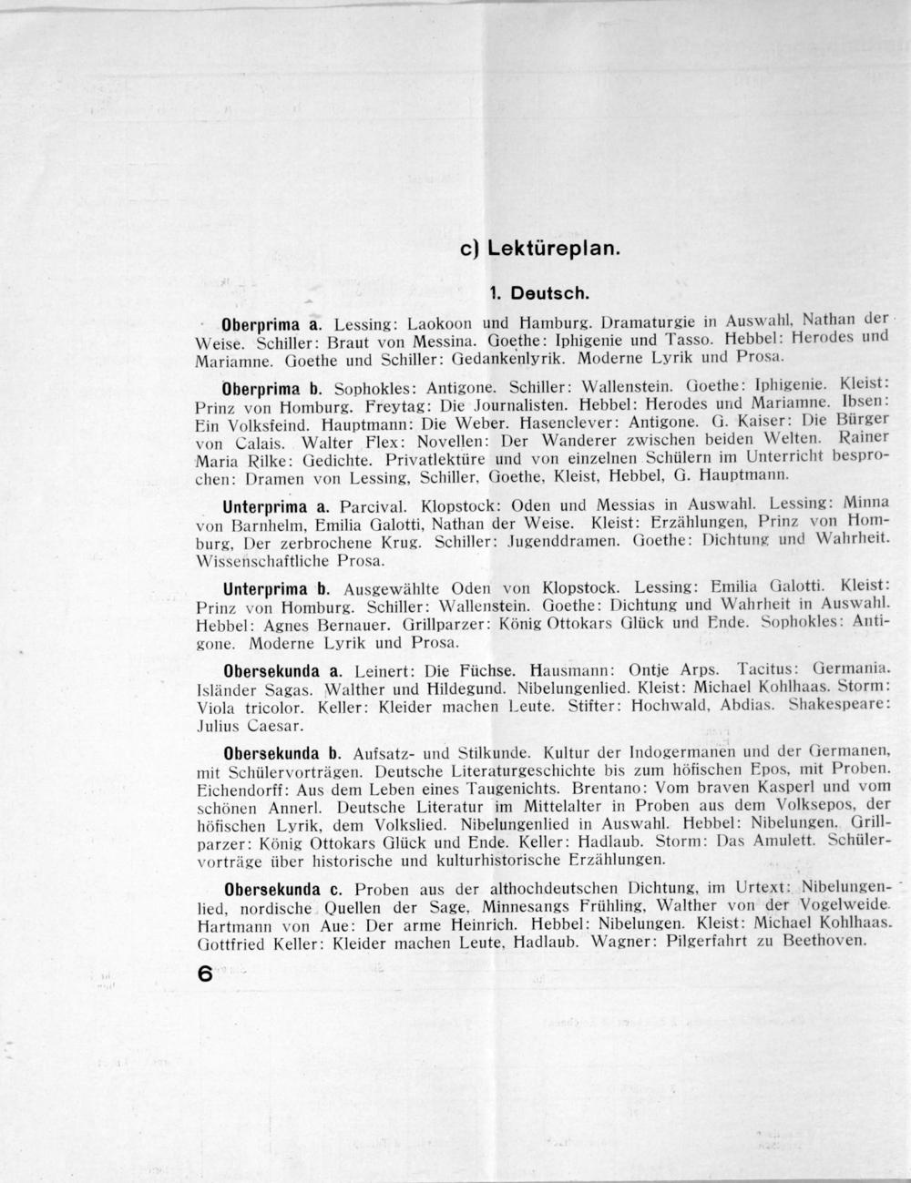 Oberprima b. Sophokles: Antigone. Schiller: Wallenstein. Goethe: Iphigenie. Kleist: Prinz von Homburg. Freytag: Die Journalisten. Hebbel: Herodes und Mariamne. Ibsen: Ein Volksfeind. Hauptmann: Die Weber. Hasenclever: Antigone. G. Kaiser: Die Bürger von Calais. Walter Flex: Novellen: Der Wanderer zwischen beiden Welten. Rainer Maria Rilke: Gedichte. Privatlektüre und von einzelnen Schülern im Unterricht bespro- chen: Dramen von Lessing, Schiller, Goethe, Kleist, Hebbel, G. Hauptmann.