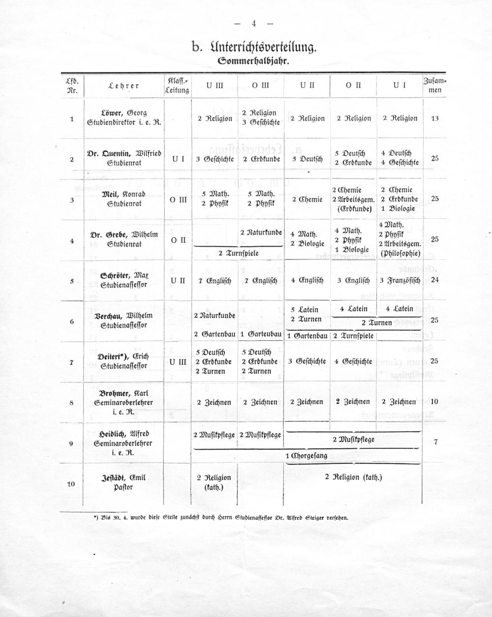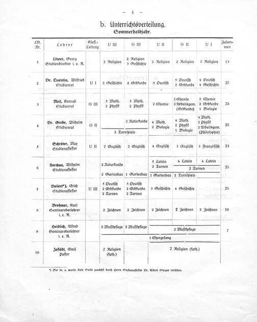 il, Konrad 5 Math. 5 Math. 2 Chemie 2 Chemie 3 Meiede OI2 vraſt 2 vean 2 Chemie 2 Arbeitsgem. 2 Erdkunde 25 (Erdkunde) 1 Biologie 4 4 Math. Dr. Grebe, Wilhelm u 2 Naturkunde 4 Math. 4 Math. 2 phyſik 2 V Studienrat 0. 2 Biologie 2 Phyſik 2 Arbeitsgem. V 2 Tarnſpiele ¹ Biologie(philoſophie) Schröter, Max 10 3. 1 2. 5 Studienaſſeſſor UI 2 Engliſch 2 Engliſch 4 Engliſch 3 Engliſch 3 Franzöſiſch V 24 5 4 Latein 4 Latein Verchau, Wilhelm 2 Naturkunde 2 Lain⸗ 25 6 Studienaſſeſſor 2 Turnen — Garienbau 1 Garteubau 1 Gartenbau 2 Turnſpiele. 4. 5 Deutſch 5 Deutſch V 1 Deitert-), Erich 1) II 2 Erdkunde 2 Erdkunde 3 Geſchichte 4 Geſchichte 25 Studienaſſeſſor 2 Turnen 2 Turnen Brohmer, Karl 8 Seminaroberlehrer 2 Zeichnen 2 Zeichnen 2 Zeichnen 2 Zeichnen 2 Zeichnen 10 i. e. R. —— 4 Heidlich, Alfred 2 Muſikpflege 2 Muſikpflege„ 9 Seminaroberlehrer 2 Muſikpflege 7 i. e. R. 1 Chorgeſang . Jeſtädt, Emil 2 Religion 2 Religion(kath.) 49 paſtor(tath.)