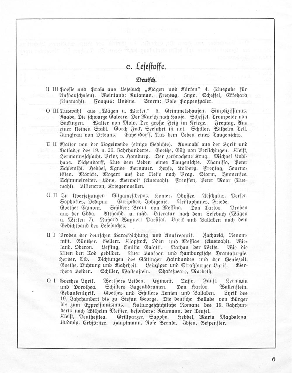 In überſetzungen: Gilgameſchepos. Homer , Odyſſee. Aeſchylus, Perſer. Sophokles, Oedipus. Euripides, Iphigenie. Ariſtophanes , Friede. Goethe: Egmont. Schiller: Braut von Meſſina. Don Carlos . Proben aus der Edda. Althochd. u. mhd. Literatur nach dem Leſebuch(Wägen u. Wirken 7). Richard Wagner: Parſifal . Lyrik und Balladen nach dem Gedichtband des Leſebuches.