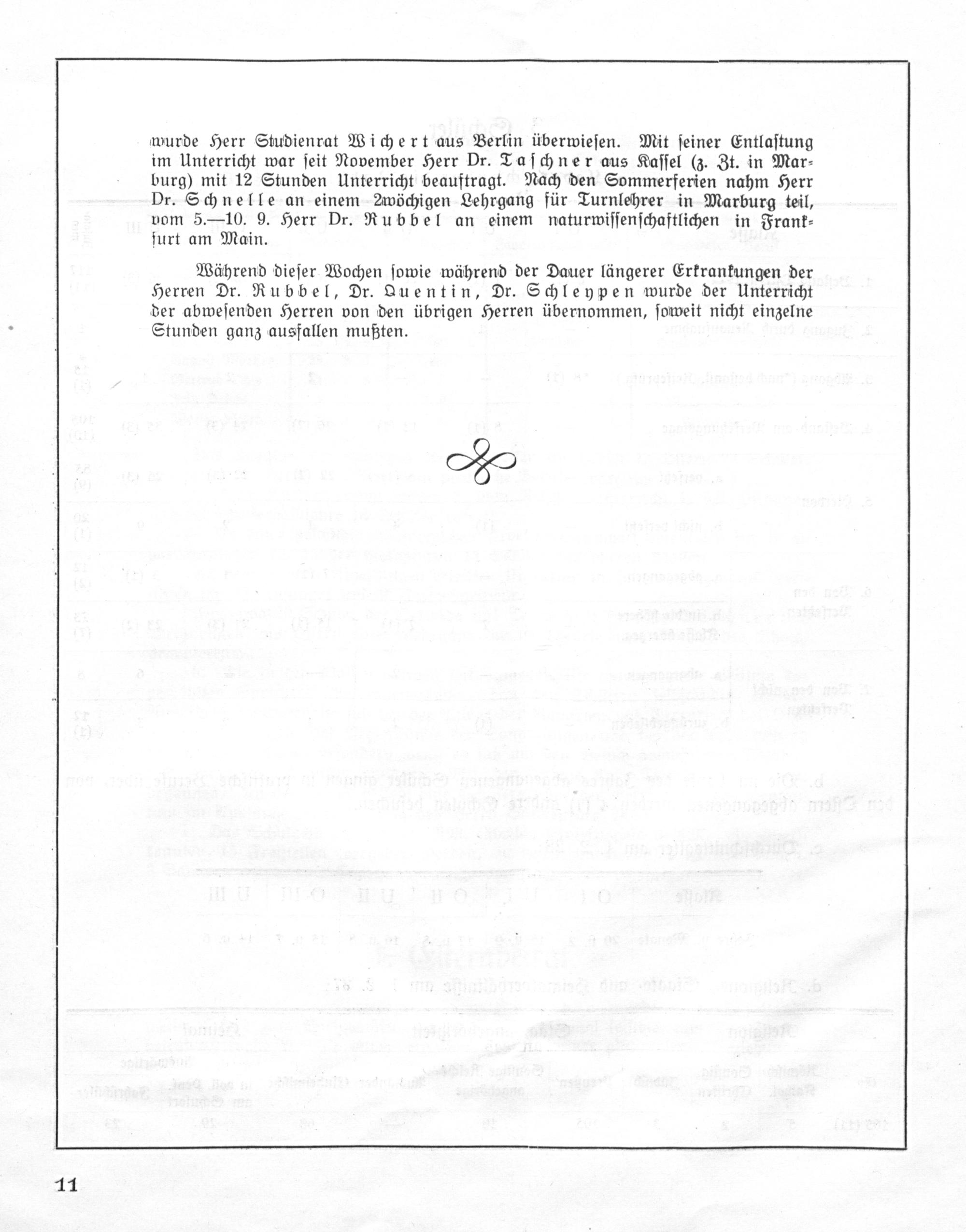 Während dieſer Wochen ſowie während der Dauer längerer Erkrankungen der Herren Dr. Rubbel, Dr. Quentin, Dr. Schleypen wurde der Unterricht der abweſenden Herren von den übrigen Herren übernommen, ſoweit nicht einzelne Stunden ganz ausfallen mußten.
