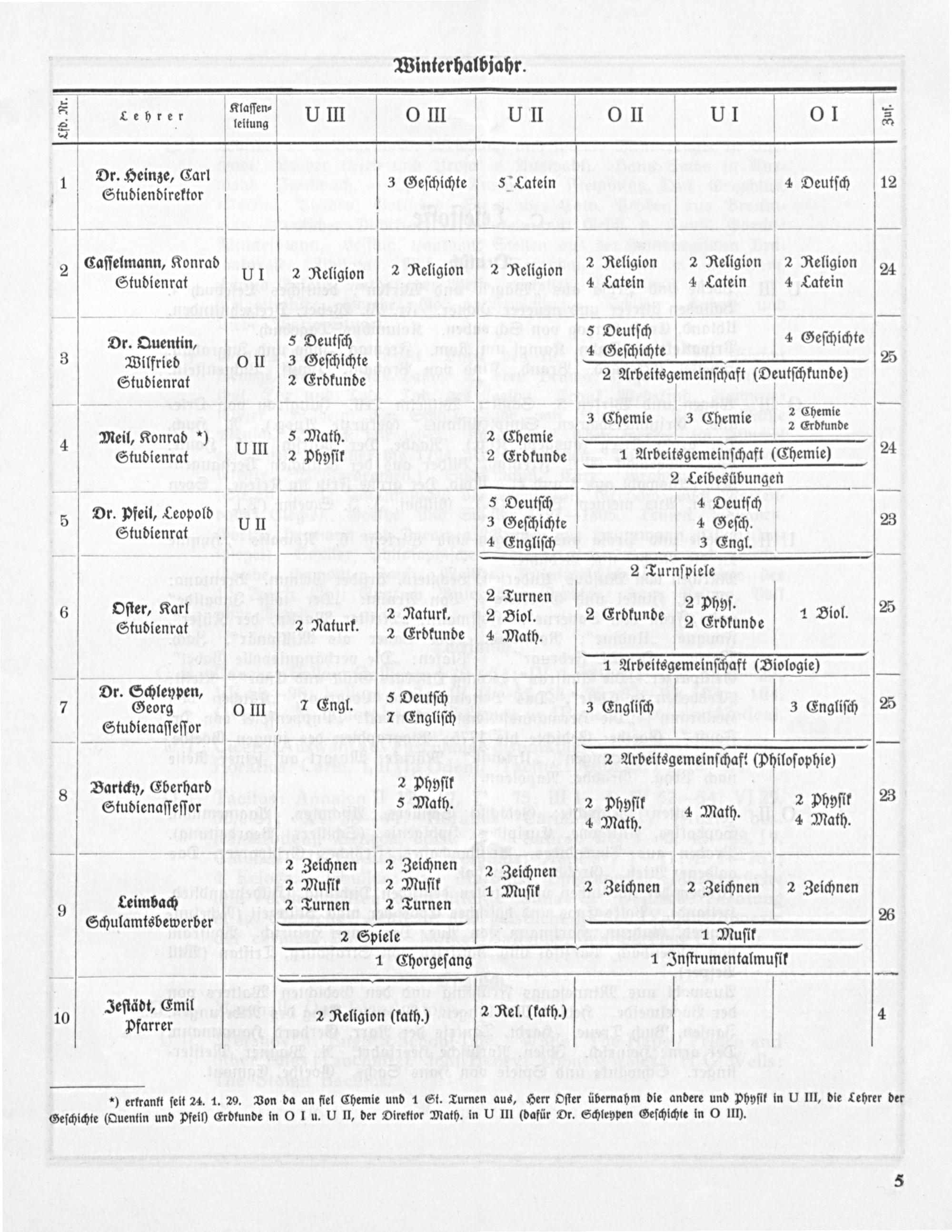 — 3 aſfer*„ 3 deeter aar U III om v On U OIl 2 2—.— V Dr. Heinze, Carl 3. 5-. 4 1 Stndienbirektor Geſchichte s Latein V Deutſch 12 Caſſelmann, Konrad 2 1 2 6 2 Religion 2 Religion 2 Religion 24 2 Studienrat UI 2² Religion Aeloion Feilolon 4 Latein 4 Latein 4 Latein 3 Dr. Quentin, 5 Deutſch 4 veuch 4 Geſchichte 2, Wilfried OII 3 Geſchichte— Studienrat 2 Erdkunde 2 Arbeitsgemeinſchaft Eoinmnre 3 3 S 3 Chemie 3 Chemie 7 Ehene 4 Meil, Konrad*) v 5 Math. 2 Chemie—.—— 24 Studienrat II 2 Phyſik 2 Erdkunde 1 Arbeitsgemeinſchaft(Chemie) 2 1 2 Leibesübungen— — 5 Deutſch 4 Deutſch 2 A Peeieavold d 3 Geſchichte Geſch. 23 A 1 4 Engliſch 13 Gngt. 2 Turnſpiele 2 Turnen 2 Phyſ. 25 6 Oſter, Karl 2 Naturk. 2 Biol. 2 Erdkunde 2 Erdkund 1 Biol. Studienrat 2 Naturk. 2 Erdkunde 4 Nath. erunn, — 1 Arbeitsgemeinſchaft(Biologie) Dr. Schleypen, 7 Georg O0 II 2⁵ Engl. vai 3 Engliſch 3 Engliſch 25 Studienaſſeſſor 2 32 2 2 aüebeioꝛemeinſchaf(Philoſophie) Baricky, Eberhard 2 Phyſik 5 Studienaſſeſſor 5 Math. 2 9 4 Math. 2 weoßt 23 4 Math.. 2 Zeichnen 2 Zeichnen 2 Zeichnen 5— 2 Muſik 2 Muſik 1 Muſit 2 Zeichnen 2 Zeichnen 2 Zeichnen 9 Leimbach 2 Turnen 2 Turnen 26 Schulamtsbewerber 2 Spiele 1 Muſik 1 Chorgeſang 1 Inſtrumentalmuſik 10 Jeſnen an 2 Religion(kath.) 2 Rel.(kath.) 4