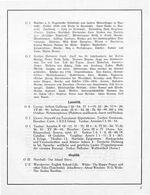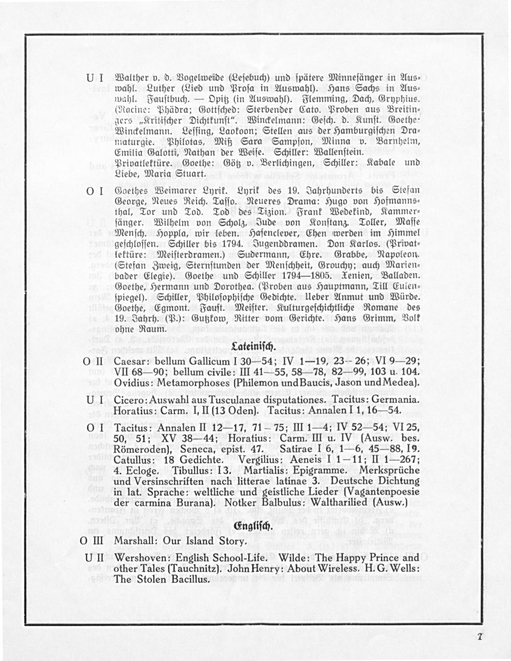 Tacitus: Annalen II 12—17, 71— 75; III 1— 4; IV 52— 54; VI 25, 50, 51; XV 38— 44; Horatius: Carm. III u. IV(Ausw. bes. Römeroden), Seneca, epist. 47. Satirae I 6, 1—6, 45— 88, 19. Catullus: 18 Gedichte. Vergilius: Aeneis I 1— 11; II 1—267; 4. Ecloge. Tibullus: I3. Martialis: Epigramme. Merksprüche und Versinschriften nach litterae latinae 3. Deutsche Dichtung in lat. Sprache: weltliche und geistliche Lieder(Vagantenpoesie der carmina Burana). Notker Balbulus: Waltharilied(Ausw.)