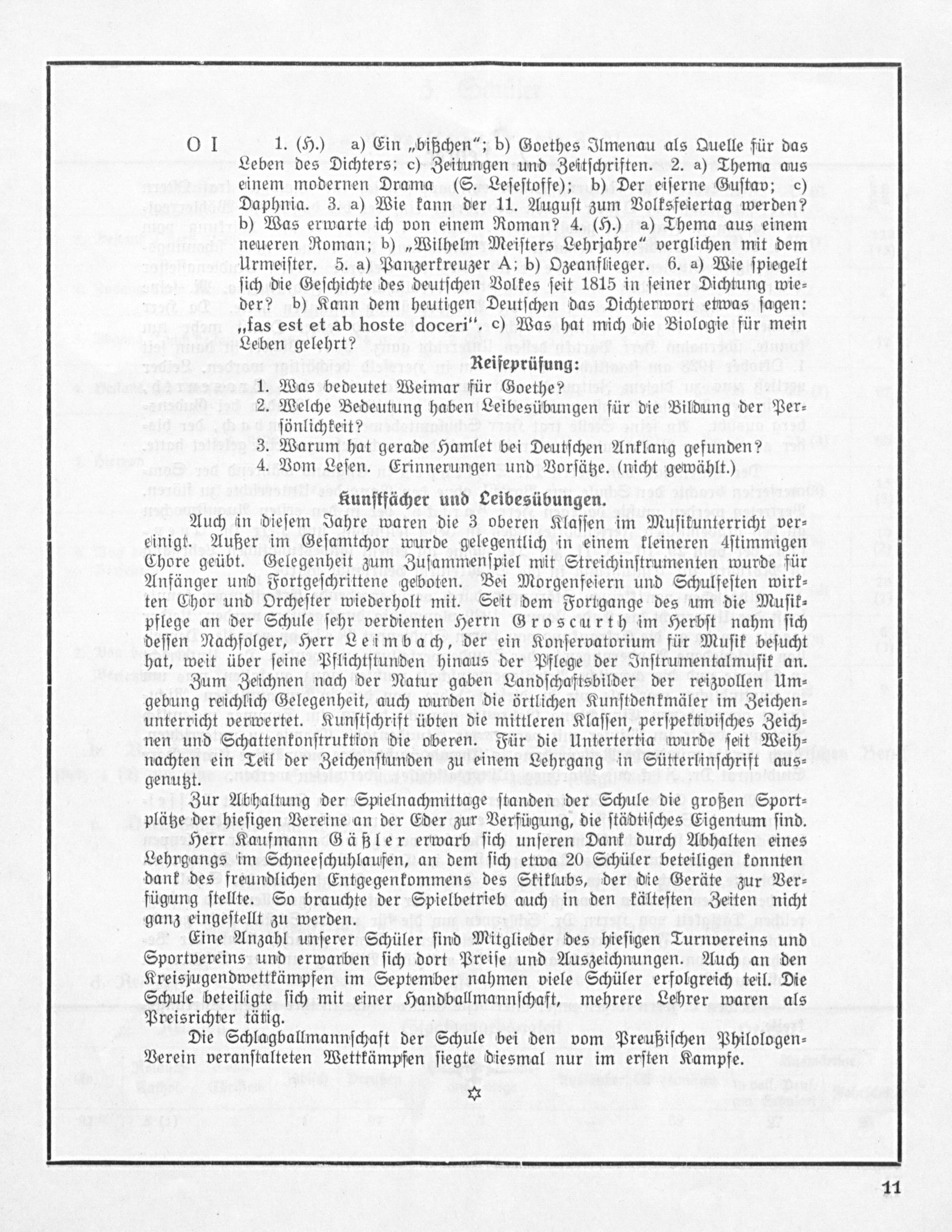 Reifeprüfung: 1. Was bedeutet Weimar für Goethe? 2. Welche Bedeutung haben Leibesübungen für die Bildung der Per⸗ ſönlichkeit? 3. Warum hat gerade Hamlet bei Deutſchen Anklang gefunden? 4. Vom Leſen. Erinnerungen und Vorſätze.(nicht gewählt.)