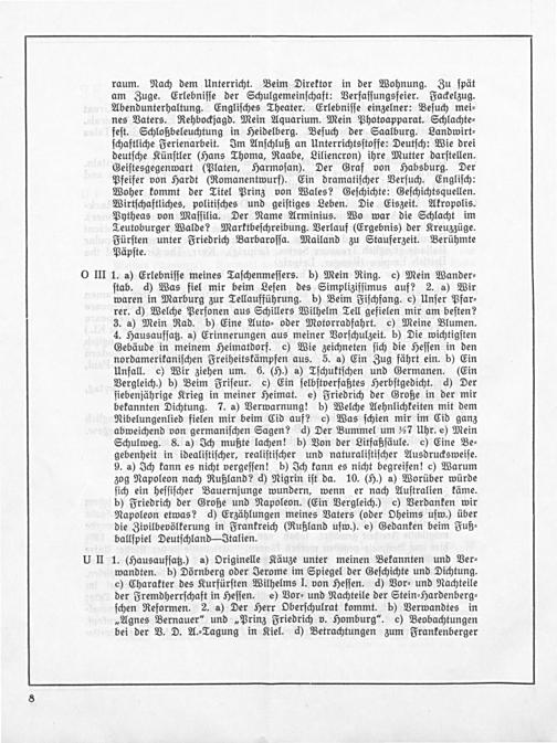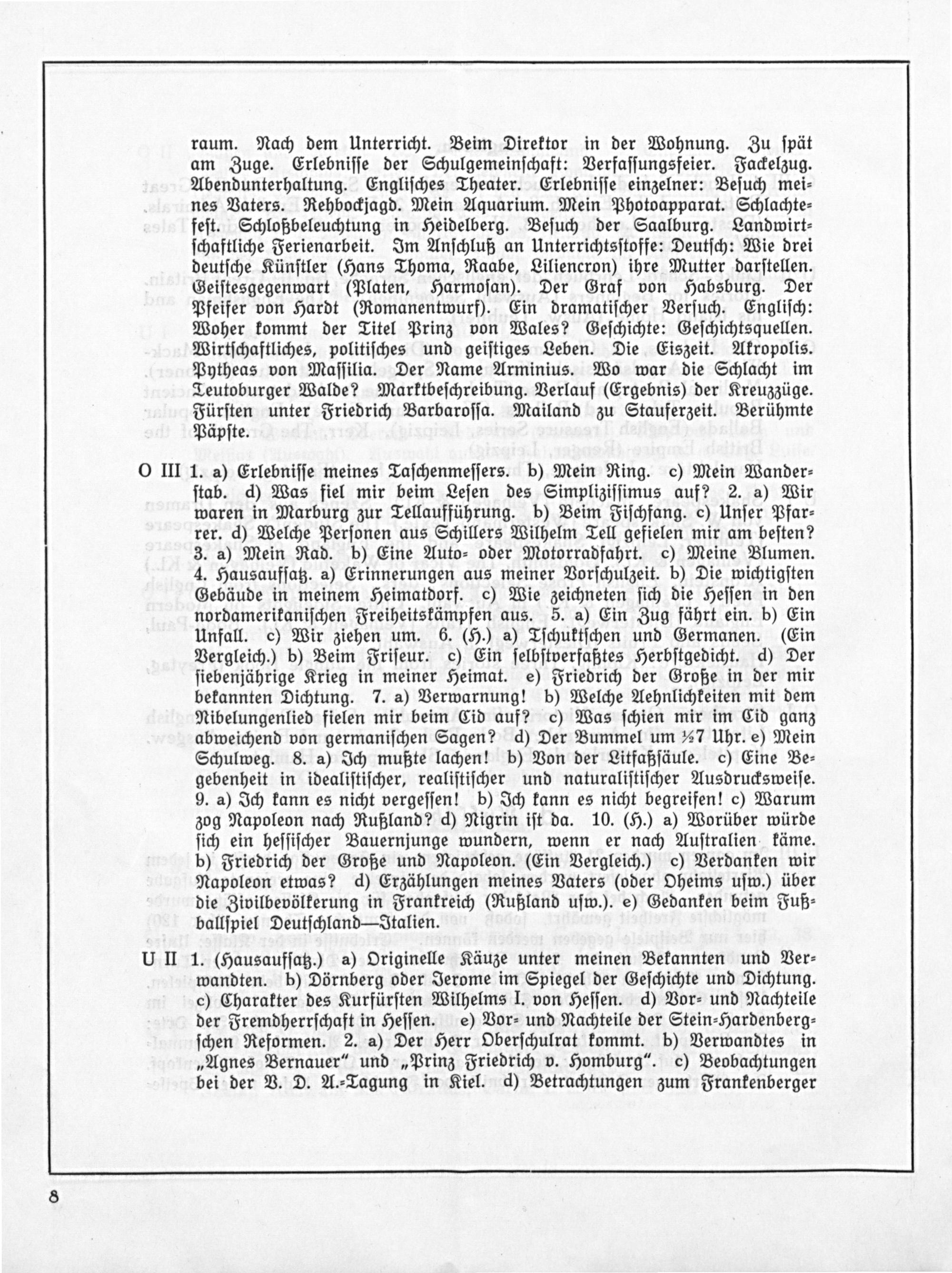 O III 1. a) Erlebniſſe meines Taſchenmeſſers. b) Mein Ring. c) Mein Wander⸗ ſtab. d) Was fiel mir beim Leſen des Simpliziſſimus auf? 2. a) Wir waren in Marburg zur Tellaufführung. b) Beim Fiſchfang. c) Unſer Pfar⸗ rer. d) Welche Perſonen aus Schillers Wilhelm Tell gefielen mir am beſten? 3. a) Mein Rad. b) Eine Auto⸗ oder Motorradfahrt. c) Meine Blumen. 4. Hausaufſatz. a) Erinnerungen aus meiner Vorſchulzeit. b) Die wichtigſten Gebäude in meinem Heimatdorf. c) Wie zeichneten ſich die Heſſen in den nordamerikaniſchen Freiheitskämpfen aus. 5. a) Ein Zug fährt ein. b) Ein Unfall. c) Wir ziehen um. 6.(H.) a) Tſchuktſchen und Germanen.(Ein Vergleich.) b) Beim Friſeur. c) Ein ſelbſtverfaßtes Herbſtgedicht. d) Der ſiebenjährige Krieg in meiner Heimat. e) Friedrich der Große in der mir bekannten Dichtung. 7. a) Verwarnung! b) Welche Aehnlichkeiten mit dem Nibelungenlied fielen mir beim Cid auf? c) Was ſchien mir im Cid ganz abweichend von germaniſchen Sagen? d) Der Bummel um ½7 Uhr. e) Mein Schulweg. 8. a) Ich mußte lachen! b) Von der Litfaßſäule. c) Eine Be⸗ gebenheit in idealiſtiſcher, realiſtiſcher und naturaliſtiſcher Ausdrucksweiſe. 9. a) Ich kann es nicht vergeſſen! b) Ich kann es nicht begreifen! c) Warum zog Napoleon nach Rußland? d) Nigrin iſt da. 10.(H.) a) Worüber würde ſich ein heſſiſcher Bauernjunge wundern, wenn er nach Auſtralien käme. b) Friedrich der Große und Napoleon.(Ein Vergleich.) c) Verdanken wir Napoleon etwas? d) Erzählungen meines Vaters(oder Oheims uſw.) über die Zivilbevölkerung in Frankreich(Rußland uſw.). e) Gedanken beim Fuß⸗ ballſpiel Deutſchland— Italien.