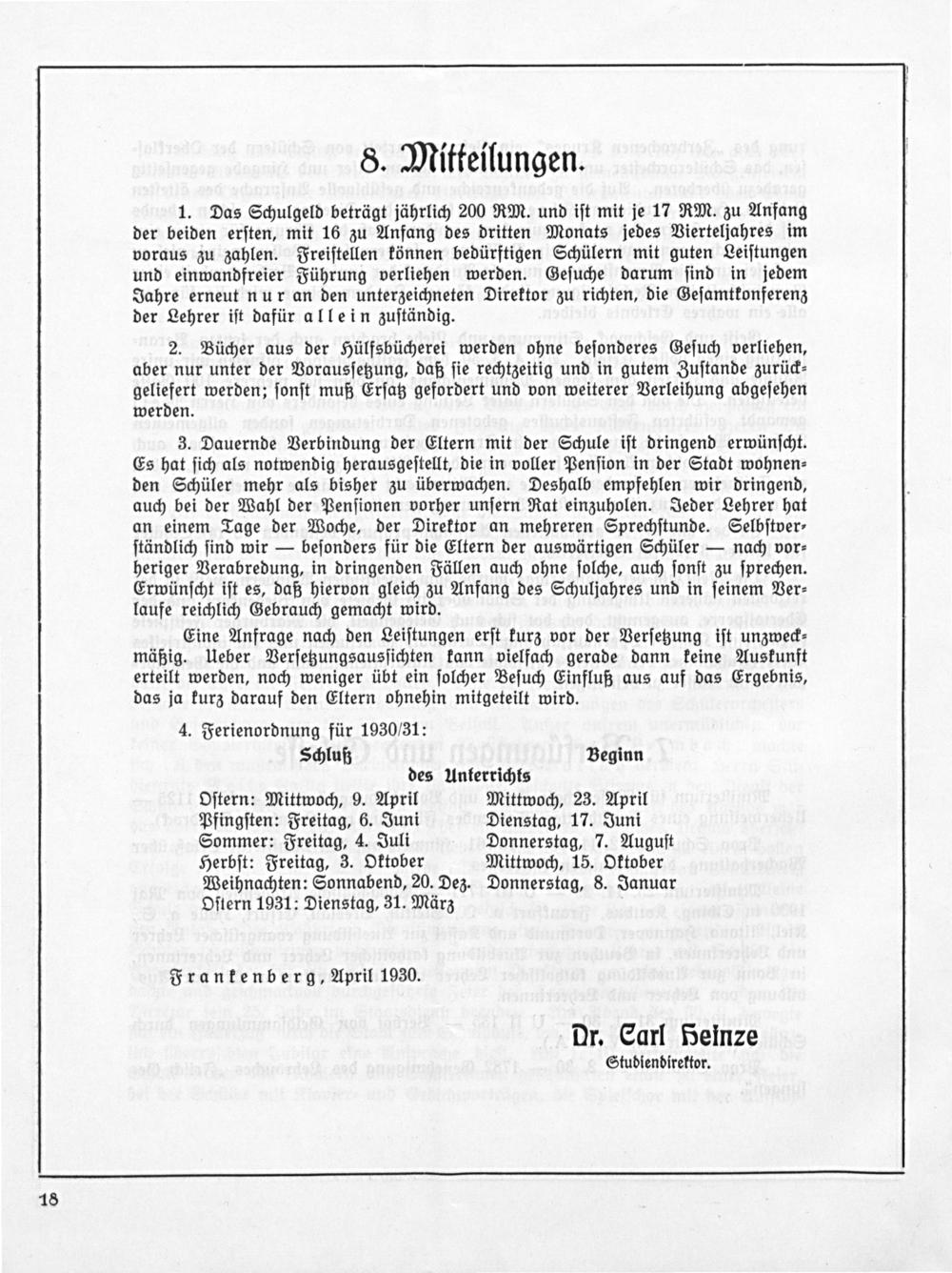 1. Das Schulgeld beträgt jährlich 200 RM. und iſt mit je 17 RM. zu Anfang der beiden erſten, mit 16 zu Anfang des dritten Monats jedes Vierteljahres im voraus zu zahlen. Freiſtellen können bedürftigen Schülern mit guten Leiſtungen und einwandfreier Führung verliehen werden. Geſuche darum ſind in jedem Jahre erneut nur an den unterzeichneten Direktor zu richten, die Geſamtkonferenz der Lehrer iſt dafür allein zuſtändig.