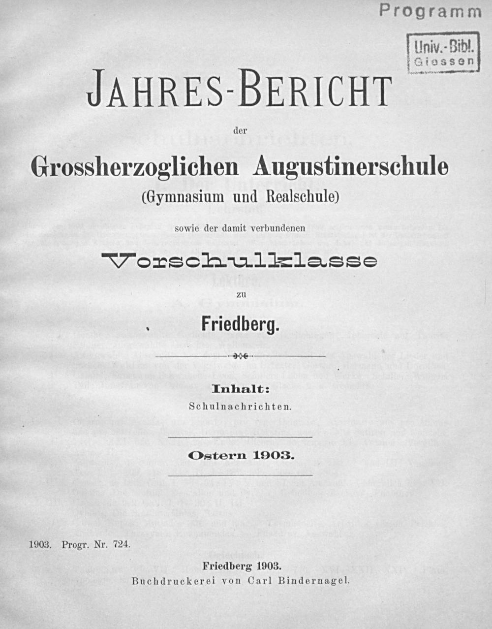 Friedberg 1903. Buchdruckerei von Carl Bindernagel.