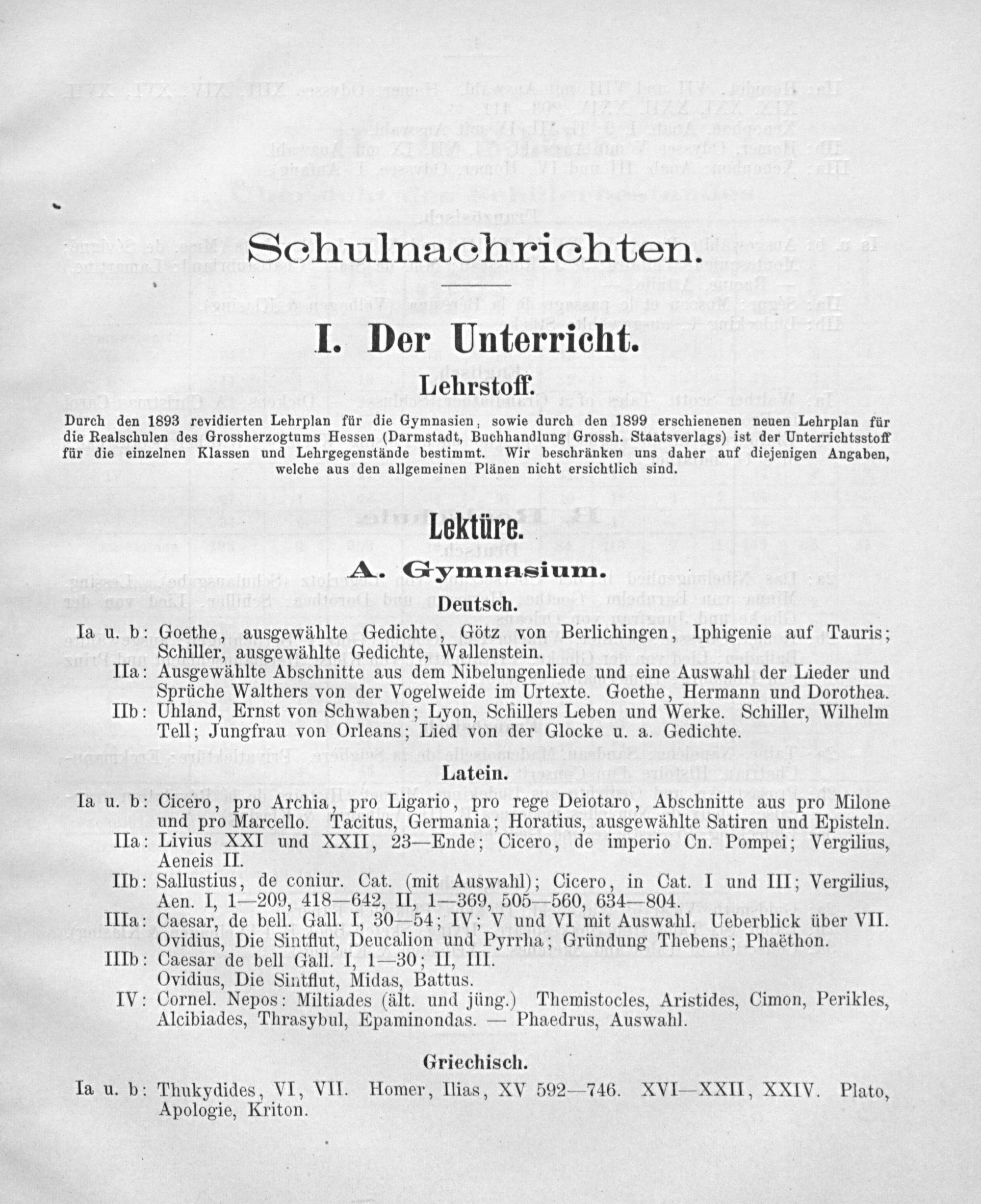 Ia u. b: Cicero, pro Archia, pro Ligario, pro rege Deiotaro, Abschnitte aus pro Milone und pro Marcello. Tacitus, Germania; Horatius, ausgewählte Satiren und Episteln. IIa: Livius XXI und XXII, 23— Ende; Cicero, de imperio Cn. Pompei; Vergilius, Aeneis II. IIb: Sallustius, de coniur. Cat.(mit Auswahl); Cicero, in Cat. I und III; Vergilius, Aen. I, 1— 209, 418— 642, II, 1—369, 505— 560, 634— 804. IIIa: Caesar, de bell. Gall. I, 30— 54; IV; V und VI mit Auswahl. Ueberblick über VII. Ovidius, Die Sintflut, Deucalion und Pyrrha; Gründung Thebens; Phaöthon. IIIb: Caesar de bell Gall. I, 1—30; II, III. Ovidius, Die Sintflut, Midas, Battus. IV: Cornel. Nepos: Miltiades(ält. und jüng.) Themistocles, Aristides, Cimon, Perikles, Alcibiades, Thrasybul, Epaminondas.— Phaedrus, Auswahl.