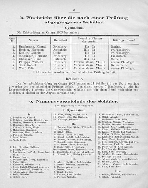Drn Namen. Heimatort. Beeucho Klgeden Künftiger Beruf. 1. Brachmann, Konrad Friedberg IIa— Ia Marine. 2. Hechler, Hermann Assenheim IIIb— la ev. Theologie. 3. Köhler, Wilhelm Utphe IIb— Ia ev. Theologie. 4. Meissinger, Hermann MFriedberg IIb— Ia Finanzfach. 5. Ohnacker, Hans Butzbach IIIa— Ia. Medicin. 6. Philipps, Wilhelm Friedberg Vorschulklasse, VI—Ila neuere Philologie. 7. Süss, Robert Friedberg Vorschulklasse, VI— Ja- Germanistik. 8. Wolf, Felix Friedberg Vorschulklasse, VI— Ia neuere Philologie.