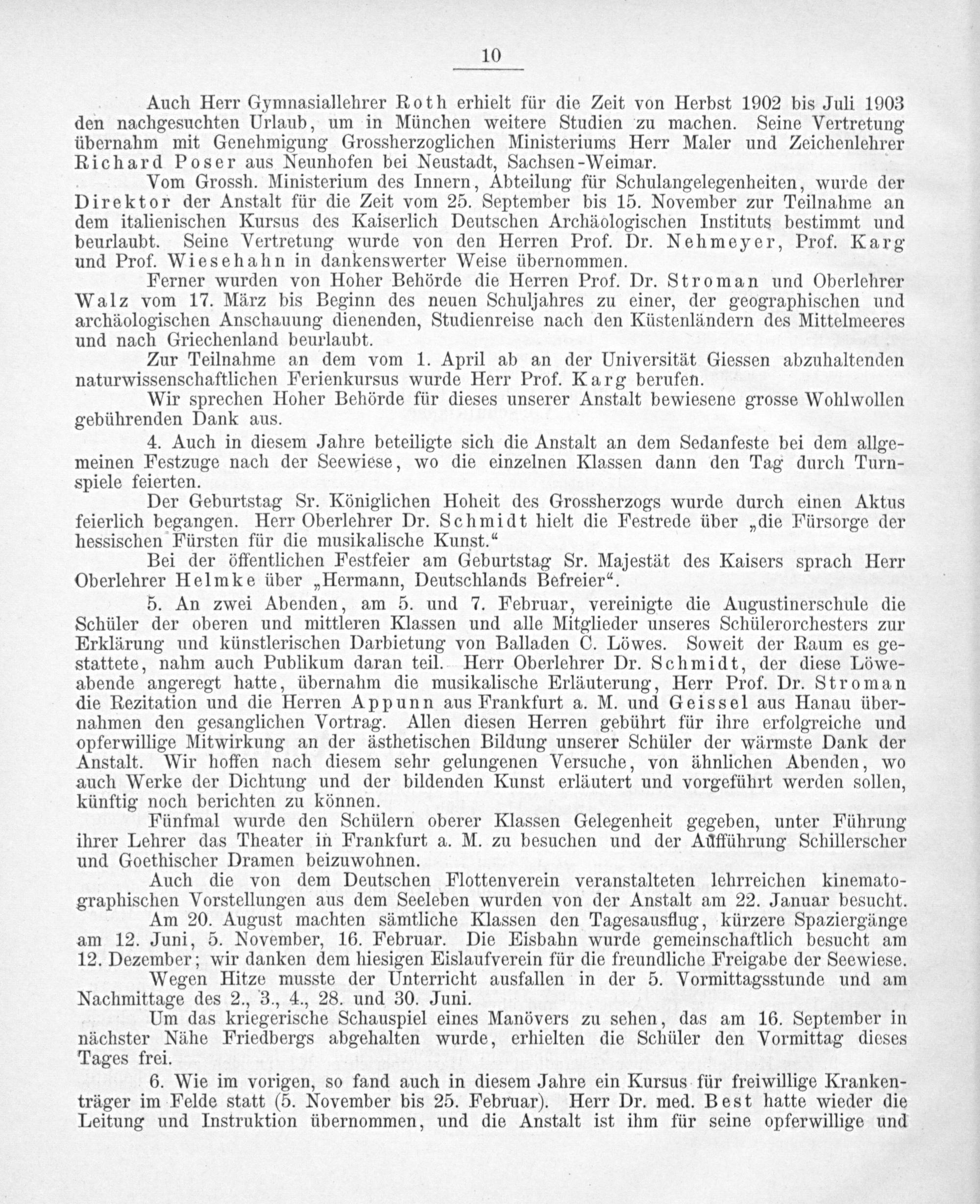 Vom Grossh. Ministerium des Innern, Abteilung für Schulangelegenheiten, wurde der Direktor der Anstalt für die Zeit vom 25. September bis 15. November zur Teilnahme an dem italienischen Kursus des Kaiserlich Deutschen Archäologischen Instituts bestimmt und beurlaubt. Seine Vertretung wurde von den Herren Prof. Dr. Nehmeyer, Prof. Karg und Prof. Wiesehahn in dankenswerter Weise übernommen.