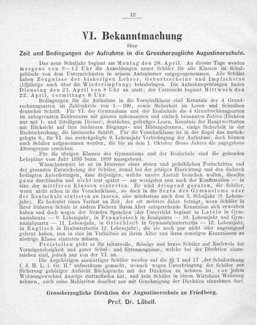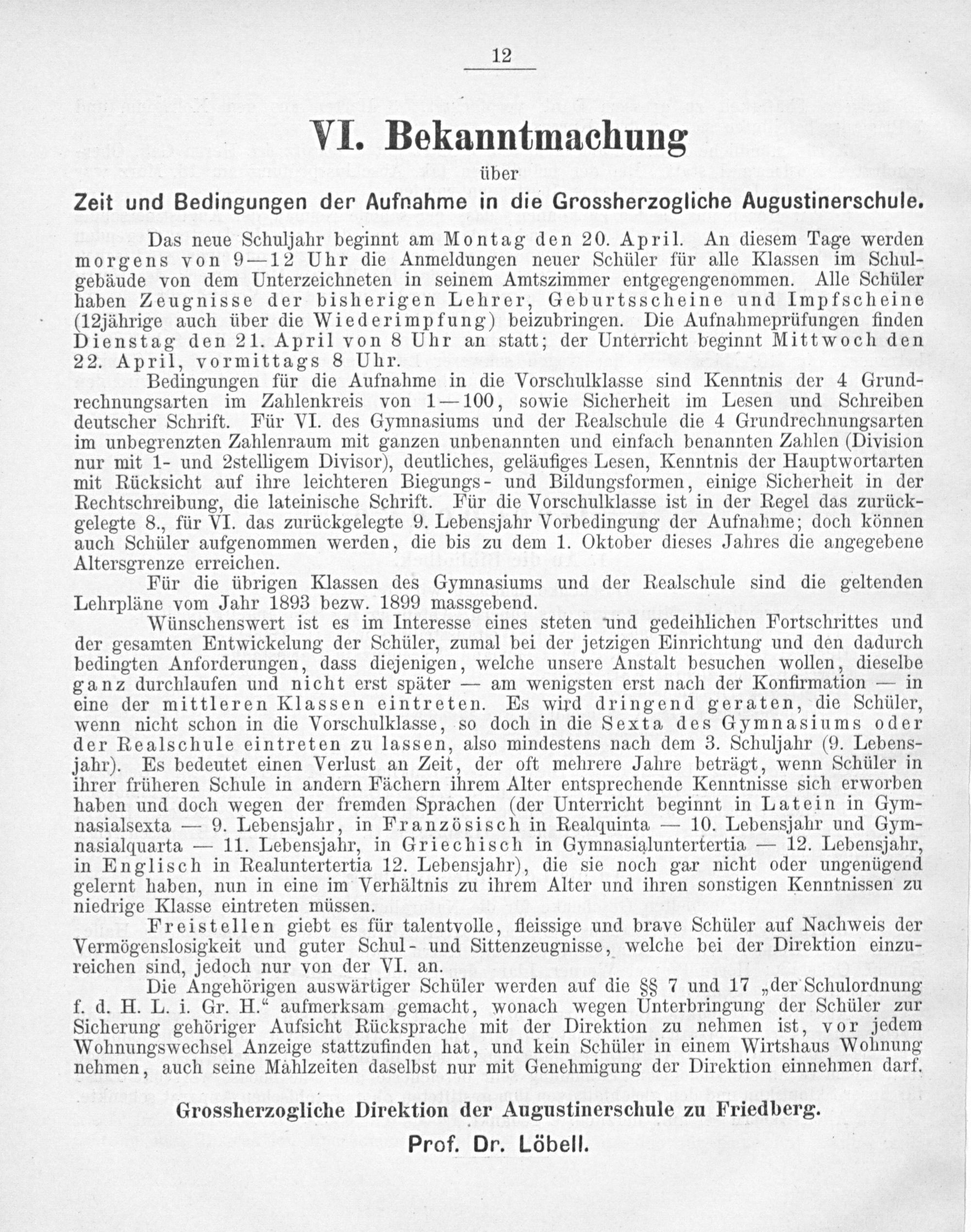 VI. Bekanntmachung über Zeit und Bedingungen der Aufnahme in die Grossherzogliche Augustinerschule.