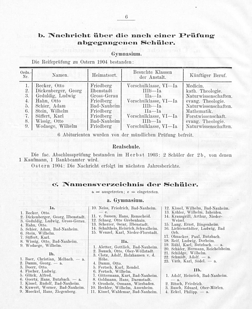 5. Schier, Adam Bad-Nauheim IIIb— Ja. Naturwissenschaften. 6. Stein, Wilhelm Friedberg IIa— Ia Mathematik.