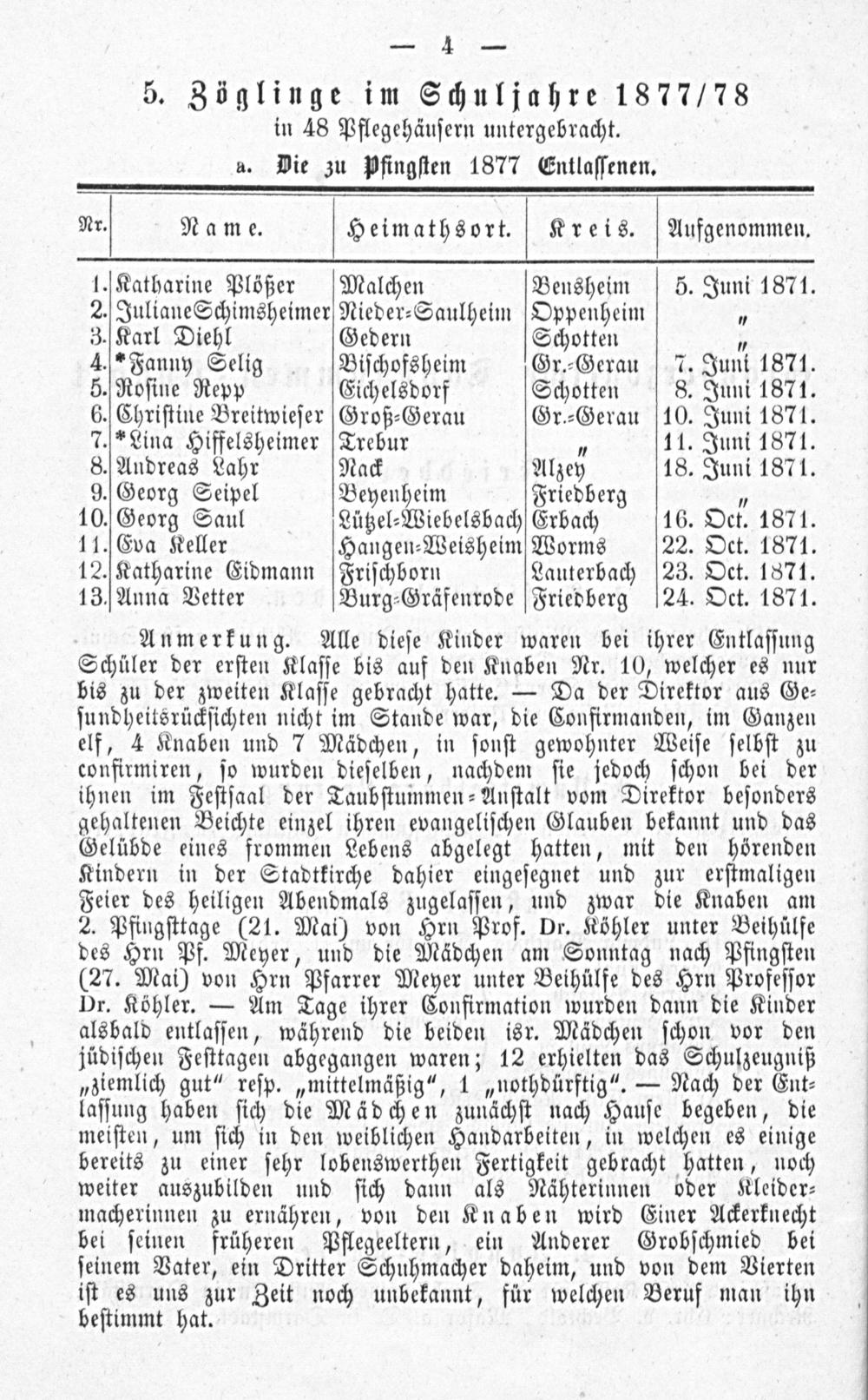 Anmerkung. Alle dieſe Kinder waren bei ihrer Entlaſſung Schüler der erſten Klaſſe bis auf den Knaben Nr. 10, welcher es nur bis zu der zweiten Klaſſe gebracht hatte.— Da der Direktor aus Ge⸗ ſundheitsrückſichten nicht im Stande war, die Confirmanden, im Ganzen elf, 4 Knaben und 7 Mädchen, in ſonſt gewohnter Weiſe ſelbſt zu confirmiren, ſo wurden dieſelben, nachdem ſie jedoch ſchon bei der ihnen im Feſtſaal der Taubſtummen⸗Anſtalt vom Direktor beſonders gehaltenen Beichte einzel ihren evangeliſchen Glauben bekannt und das Gelübde eines frommen Lebens abgelegt hatten, mit den hörenden Kindern in der Stadtkirche dahier eingeſegnet und zur erſtmaligen Feier des heiligen Abendmals zugelaſſen, und zwar die Knaben am 2. Pfingſttage(21. Mai) von Hrn Prof. Dr. Köhler unter Beihülfe des Hrn Pf. Meyer, und die Mädchen am Sonntag nach Pfingſten (27. Mai) von Hrn Pfarrer Meyer unter Beihülfe des Hrn Profeſſor Dr. Köhler.— Am Tage ihrer Confirmation wurden dann die Kinder alsbald entlaſſen, während die beiden isr. Mädchen ſchon vor den jüdiſchen Feſttagen abgegangen waren; 12 erhielten das Schulzeugniß „ziemlich gut“ reſp.„mittelmäßig“, 1„nothdürftig“.— Nach der Ent⸗ laſſung haben ſich die Mädchen zunächſt nach Hauſe begeben, die meiſten, um ſich in den weiblichen Handarbeiten, in welchen es einige bereits zu einer ſehr lobenswerthen Fertigkeit gebracht hatten, noch weiter auszubilden und ſich dann als Nähterinnen oder Kleider⸗ macherinnen zu ernähren, von den Knaben wird Einer Aeckerknecht bei ſeinen früheren Pflegeeltern, ein Anderer Grobſchmied bei ſeinem Vater, ein Dritter Schuhmacher daheim, und von dem Vierten iſt es uns zur Zeit noch unbekannt, für welchen Beruf man ihn beſtimmt hat.