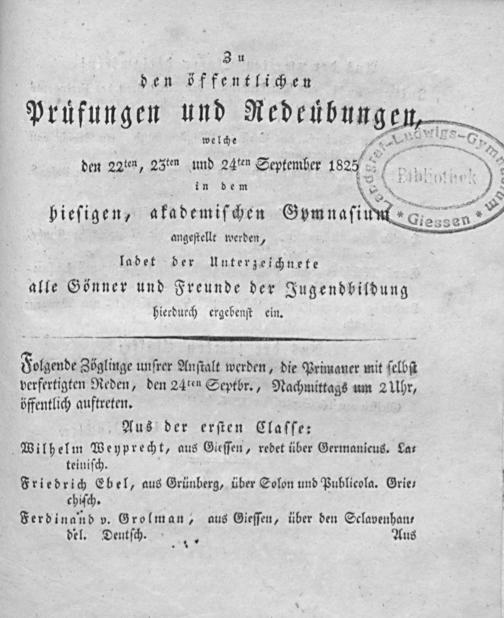 ,Aus’ der erstens Classe: Wilhelm Wet)p1echt, ans Giesseii, redet uber Germaniens. Lu- teinifch. Friedrich Ebkl, ans Grünbexg, über Solonnnd Publicola. Grie- chifch. Ferdiita«i·kd v. Gro( man, aus Giesseii, über dm Sklavenban- del. Deutsch.- Atts