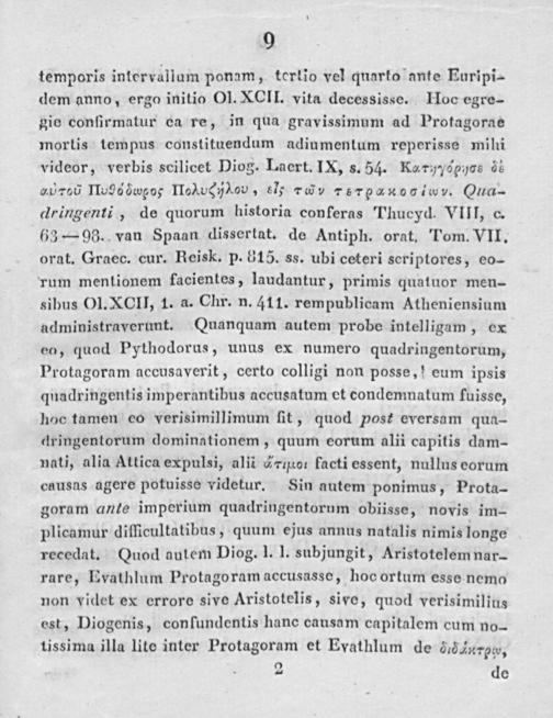 tempokis inlcrvijllum ponam, tcktso ve! qnnrtckante Euripi- (lem anno, ergo jnitio 01.Xcll. vita decessisse. Iloc agre- gio confirmattir ca ke, in qua gravissimttni ad Protagome mortis tempus constituendum adiumcntum keperisse milii videor, ver-bis scilicct Diog. Lackk. IX, s. 54. Rezsxwdkyose öå CLJToü Husäöchof Hokus-FRAU- 675 His» esfponcocfcu». Cim- slxiyigkyzri, do quorum historia conkeras T11u0y(1. Vlll, c. s53—98..van spaan disscktat. do Antip11. omt. Tom-Vll. orut. Gmec. cui-. Reisk. p.815. ss. ubi ceteki scriptotses, eq- ’r11m mentionem kacientes, Imulükltur, primis quatuor men- silms()1.xcll, I. a. chr. n. 411. rempublicam Ätltenjensium administravcrunt. Quanquam gutem probe intelligam, ex en, quocl Pythodorus, unus ex numero quadringentorum, Protagomm accusaverit, certo colligi non posse,! eum jpsis quadringentis impemntibus accusutum et contlemnatum fuisse, hoc tamett eo vekjsimilljmum lit, quotl post eveksnm qua- eltingentorttm dominationem, qm1m eokum alii capitis dum- nati, alia Attica expulsi, alii cis-Wo- kactiossent, nullus corum cnusas engere potuisse viele-tun sin gutem ponimus, Prata- gokam cmte impcrittm quadrjngentorum obiissc, novis im- plicamur dimcultatibus, quum eins annus natulis nin1isjonge reeednt. Qnotl gutem Diog. l. l. subjungit, Akistotelem nat-.- rake, Evatlilum Protagoram accusnsso, hoc orthm esse ncmo non videt ex crroro sivo Äristotelfs, sivo, qnod verisimilius est, Diogcnis, conkundcntis Iumc causom capitnlem cum no-