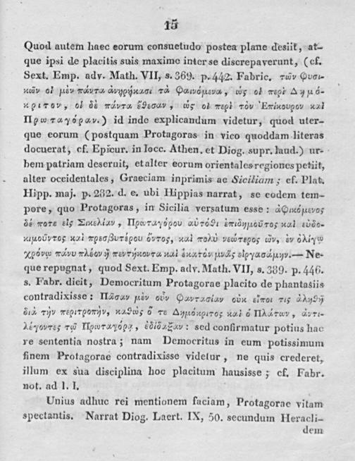 Quod gutem lxaec komm consuctudo postae- plane ckesiik, cr- que ispsi de placitsixs suis maximo imcr se discrepavekitnt,(ck. sexh Emp. adv. Math. v11, s. 369·. p-44,2. Fabric. nö» sowo- misv ok-»Hu-XXVI-« ävypxszmj Mk ØOtVZFZM, ask of Epis- AJ»ä- Ky«70»«, of« öå swswm III-M-- ess- oc« Aska kös- Ihrigen-pas xxi Ilpw HwöpavJ id indo explicandum vidctur, quoel nier- quse eokum(postquam.P1-otagoras— in vico quoddam 1itekass docuerat, of. Epicur. in1"occ. Äther-. et Diog. supr.I-aud.) ur-- bempatrjam deseruit, eta1t01· eorum qrienbalooresgioncs petjit, alter occitlcntales, Gracciam- inprimis« no Ficilsiayøx ,- cf. Plat. Hipp. maj. P- 282. d. e. ubi Hippias narrat, so eodem rein- pok9, quo Protagoæss, in· sicilia versatum esse: ästimözxews Ic« wofs 515 TMIÄLW, ITFcuTst-e)«pou oc1370«—94 3w157»055705 Its-X küsse- kujaoüwox sey-Z AFSCJZUTFFOU Z«1-70,·, Køi Ast-M was-»Fo; est-, Is» HMWI xpövku mit-u»Um-s Fsv7sjdcov7a MS Zazfö-v,»»ä25 skpyawTHv.-— Ne- que kepugnat, quod sext. Emp. adv. Muth.v11, S. 389. p. 44f5. s. Fabr- dioit, Democrjtum Protagorue placito defphantasiis contradfxissss III-w»Di-»Fr- Øøvkzosiav cis-c skwoi 715 IIÄyst ZUL 7))1- NEWTON-IV»Ist-If F 78 As-;»c«xp«7o;- wi- o« lIÄaLsz, als-»- wakzs 7927 chwyäpkz, HZJZIELU: scd covürn1atur potitis hin-. re- sententia nostra; Imm Dcmockjtus in cum potjssimum Huenj Professor-ne contradixisse videlur, ne quis Weder-eh illum ex s«ua disciplitm hoc placjtum 11ausissez« ef. Fabr. not. ad l. I.»