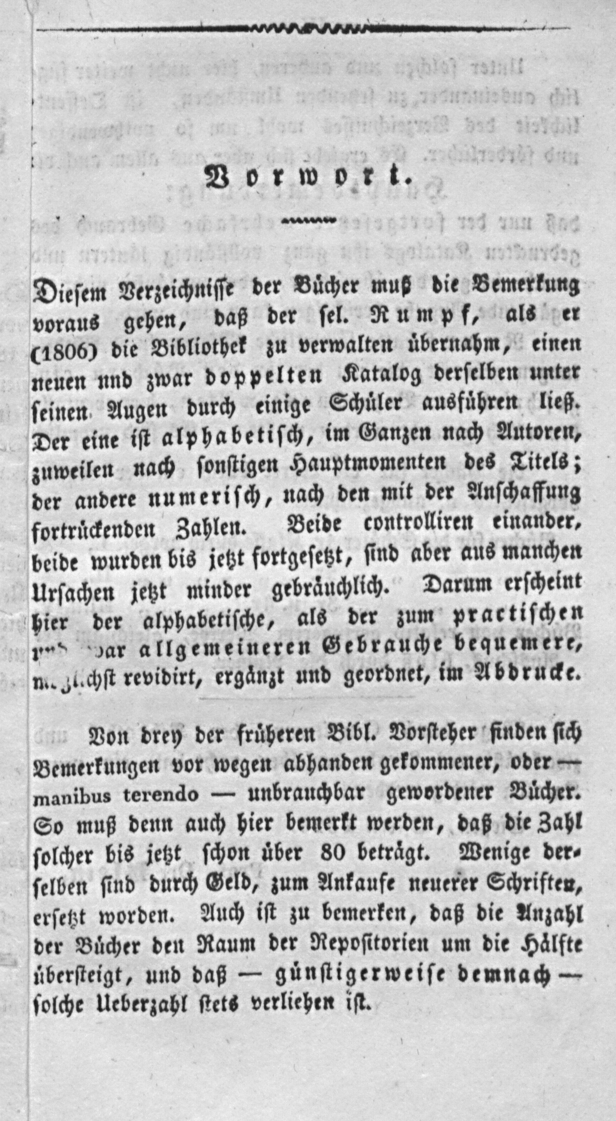 Diesem Verzeichnisse der Bücher muß die Bemerkung voraus gehen, daß der sel. R n m p s, acc« kk (1806) die Bibliotbel zu verwalten übernahm, einen neuen nnd zwar doppelten Katalog derselben unter seinen» Augen durch einige Schüler ausführen ließ. Der eine ist alpbabetisch, im Ganzen nach Anwen- zuweilen nach sonstigen Hauptmomenten des Titel-; der andere numerisch, nach den mit der Anschaffung fortrückendcn Zahlen. Beide controlliren einander- beide wurden bis jetzt fortgesetzt, sind aber aus manchen Ursachen jetzt minder gebräuchlich. Darum erscheint hier der alphabetische, als der zum praktischen r"« var allgemeineren Gebrauchebequemere, unglchst revidirt, ergänzt und geordnet, im Abdrücke.