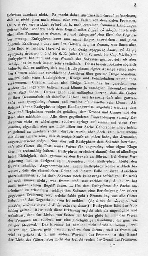 Sokrates durchaus nicht. Er macht daher ausdrücklich darauf aufmerksam, daſs er nicht etwa nach einem oder zwei Fällen von dem vielen Frommen, (E r* 5 duο σν½ mꝓτπαν ÿ§ι⁶α) d. h. nach einzelnen frommen Handlungen gefragt habe, sondern nach dem Begriff selbst(aur 0 eldog), durch wel- chen alles Fromme eben fromm ist, und dringt auf eine förmliche Begriffs- bestimmung. Euthyphron kann nun nicht länger ausweichen, und giebt folgende Erklärung: das, was den Göttern lieb, ist fromm, was ihnen aber nicht lieb, ist ruchlos.(2 ⁊ν τ⁶ εν τσm⁵εαο* e.09¹15 d600„9, 70 d8 1 7908p¹248 4.16610*) P. 5. C bis 6. E.(oder Cap. V. med. bis Cap. VI. fin.)— Euthyphron hat nun auf den Wunsch des Sokrates geantwortet, ob aber richtig, das ist noch immer sehr zweifelhaft. Dieses beweist Sokrates sogleich dadurch, daſs er anführt, daſs nach Euthyphrons eigner Aussage selbst unter den Göttern nicht nur verschiedene Ansichten über gewisse Dinge obwalten, sondern daſs sogar Uneinigkeiten, Kriege und Feindschaften unter ihnen vorkommen. Offenbar halten also Einige Götter das für gerecht, was Andere für ungerecht halten, sonst könnte ja unmöglich Uneinigkeit unter ihnen Statt finden. Daraus gehe aber unläugbar hervor, daſs die Götter in ihrer Gesammtheit oft dasselbe lieben und hassen; dals also gottver- hafst und gottgeliebt, fromm und ruchlos oft dasselbe sein könne. Als Beispiel könne Euthyphrons eigne Handlungsweise angeführt werden; dem Zeus und Hephaistos werde sie gefallen, dem Kronos und Uranos und der Here aber miſsfallen.— Alle diese gegründeten Einwendungen vermag Eu- thyphron nicht zu widerlegen, sondern springt auf einmal auf etwas Ver- wandtes, eigentlich aber gar nicht näher zur Sache Gehörendes über, indem er geltend zu machen sucht: darüber werde aber doch kein Gott uneins mit einem andern sein, daſs derjenige Strafe zu leiden habe, der Jemanden ungerechterweise tödte. Nun aber soll Euthyphron dem Sokrates beweisen, daſs alle Götter die That seines Vaters für ungerecht, seine eigne Klage aber für rechtmäſsig halten. Euthyphron erwiedert darauf, das sei allerdings keine Kleinigkeit, doch getraue er den Beweis zu führen. Bei dieser Ver- sicherung hat es übrigens sein Bewenden, und Euthyphron bleibt den Beweis schuldig. Angenommen aber auch, Euthyphron könne wirklich be- weisen, daſs die sämmtlichen Götter bei diesem Falle in ihren Ansichten übereinstimmten, so ist doch Sokrates noch keineswegs befriedigt. Er weiſs ja noch immer nicht, was fromm und was ruchlos ist, d. h. er hat noch immer keinen Begriff davon.— Um dem Euthyphron die Sache an- scheinend zu erleichtern, schlägt ihm Sokrates eine Berichtigung der zuletzt gegebenen Erklürung vor, welche dahin geht: Fromm ist, was alle Götter lieben, und das Gegentheil davon ist ruchlos.(dg 6 y dvν e es ol 902 119Ge, aν⁹σν 86Ti, 6& Ar„116 G„, 6G¹0vy.) Euthyphron läſst den Vor- schlag gelten. Aber auch diese Erklärung ergiebt sich als ungenügend und unhaltbar, denn das Lieben von Seiten der Götter giebt ja nicht das Wesen des Frommen an, sondern nur eine gleichgültige Beziehung, ein ganz zu- fülliges Merkmal. Das Fromme ist nämlich nicht deshalb fromm, weil es von den Göttern geliebt wird, sondern eben darum, weil es fromm ist, wird es geliebt, d. h. mit andern Worten: das Fromme ist der Grund der Liebe der Götter, aber nicht das Geliebtwerden der Grund des Frommen.