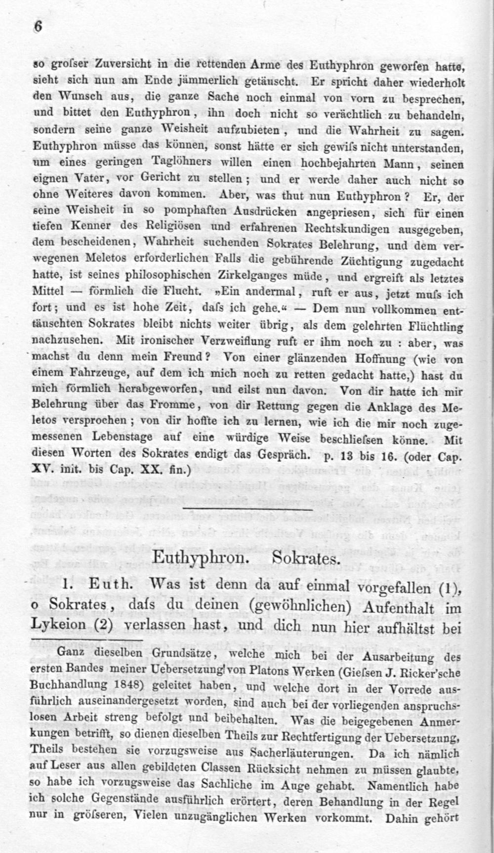 so groſser Zuversicht in die rettenden Arme des Euthyphron geworfen hatte, sieht sich nun am Ende jämmerlich getäuscht. Er spricht daher wiederholt den Wunsch aus, die ganze Sache noch einmal von vorn zu besprechen, und bittet den Euthyphron, ihn doch nicht so verächtlich zu behandeln, sondern seine ganze Weisheit aufzubieten, und die Wahrheit zu sagen. Euthyphron müsse das können, sonst hätte er sich gewiſs nicht unterstanden, um eines geringen Taglöhners willen einen hochbejahrten Mann, seinen eignen Vater, vor Gericht zu stellen; und er werde daher auch nicht so ohne Weiteres davon kommen. Aber, was thut nun Euthyphron? Er, der seine Weisheit in so pomphaften Ausdrücken angepriesen, sich für einen tiefen Kenner des Religiösen und erfahrenen Rechtskundigen ausgegeben, dem bescheidenen, Wahrheit suchenden Sokrates Belehrung, und dem ver- wegenen Meletos erforderlichen Falls die gebührende Züchtigung zugedacht hatte, ist seines philosophischen Zirkelganges müde, und ergreift als letztes Mittel— förmlich die Flucht.„Ein andermal, ruft er aus, jetzt mufs ich fort; und es ist hohe Zeit, daſs ich gehe.«— Dem nun vollkommen ent- täuschten Sokrates bleibt nichts weiter übrig, als dem gelehrten Flüchtling nachzusehen. Mit ironischer Verzweiflung ruft er ihm noch zu: aber, was machst du denn mein Freund? Von einer glänzenden Hoffnung(wie von einem Fahrzeuge, auf dem ich mich noch zu retten gedacht hatte,) hast du mich förmlich herabgeworfen, und eilst nun davon. Von dir hatte ich mir Belehrung über das Fromme, von dir Rettung gegen die Anklage des Me- letos versprochen; von dir hoffte ich zu lernen, wie ich die mir noch zuge- messenen Lebenstage auf eine würdige Weise beschlieſlsen könne. Mit diesen Worten des Sokrates endigt das Gespräch. p. 13 bis 16.(oder Cap. XV. init. bis Cap. XX. fin.)