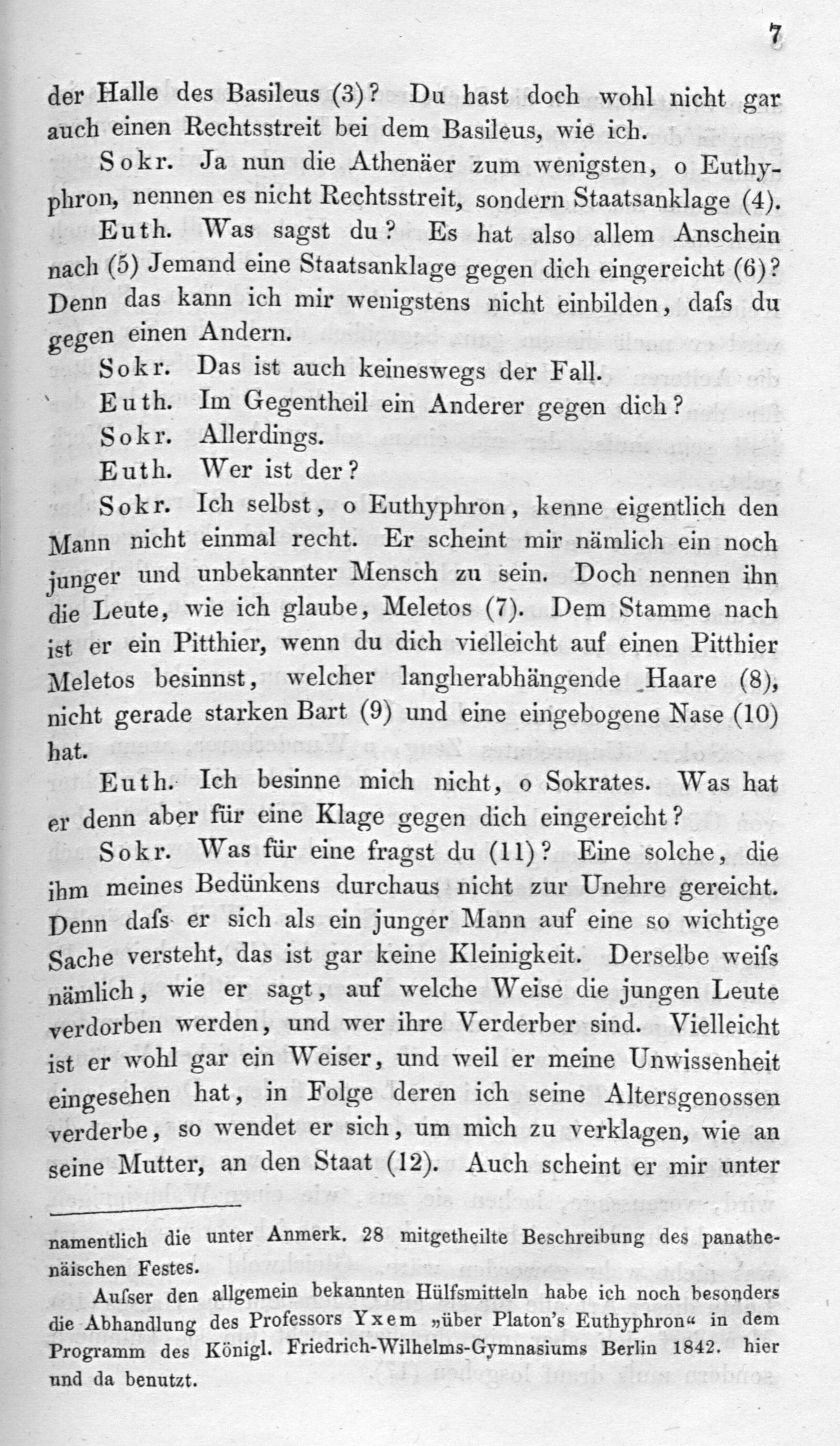 Euth. Was sagst du? Es hat also allem Anschein nach(5) Jemand eine Staatsanklage gegen dich eingereicht(6)? Denn das kann ich mir wenigstens nicht einbilden, daſs du gegen einen Andern.