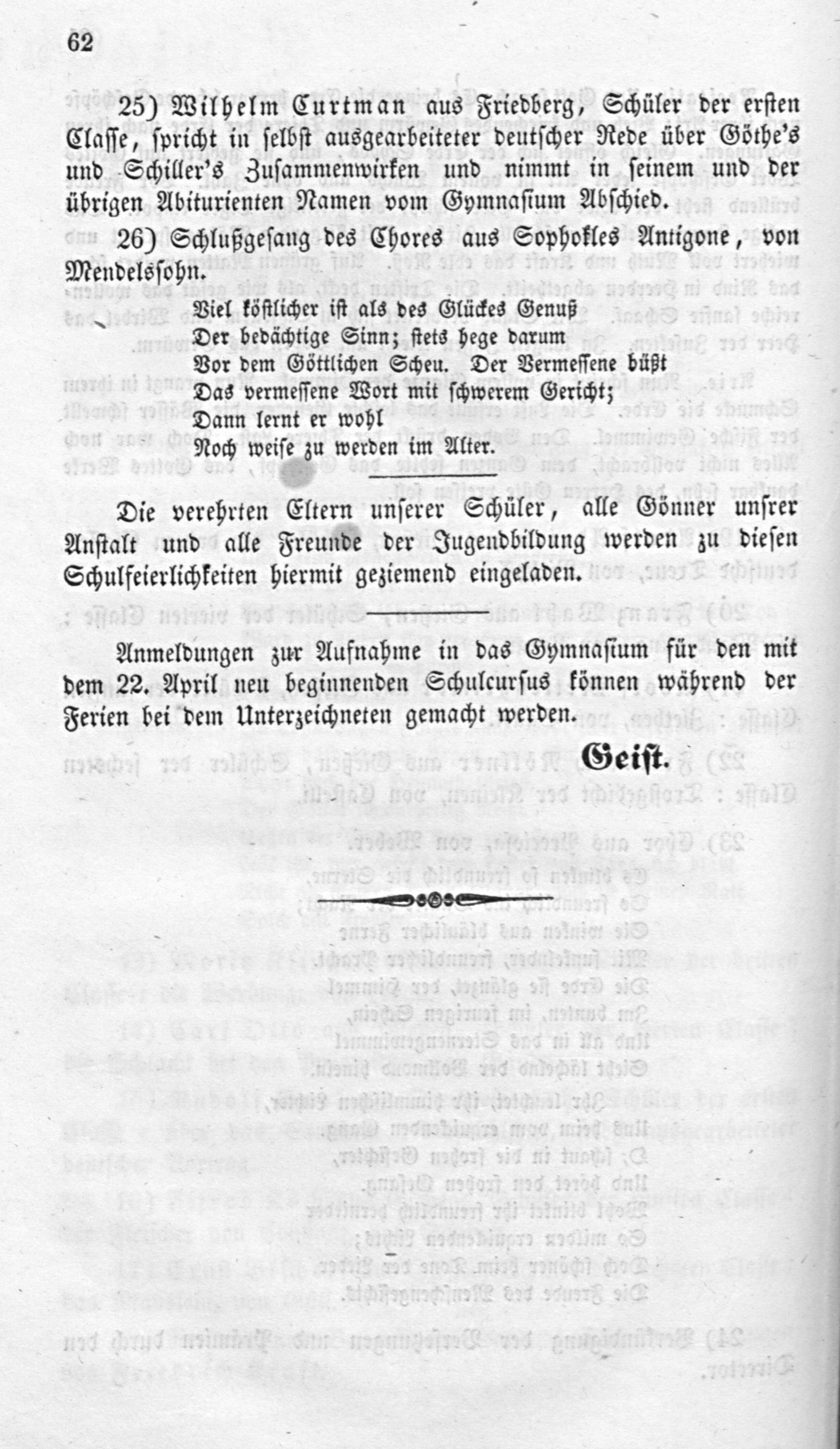 25) Wilhelm Curtman aus Friedberg, Schüler der erſten Claſſe, ſpricht in ſelbſt ausgearbeiteter deutſcher Rede über Göthe's und Schiller's Zuſammenwirken und nimmt in ſeinem und der übrigen Abiturienten Namen vom Gymnaſium Abſchied.