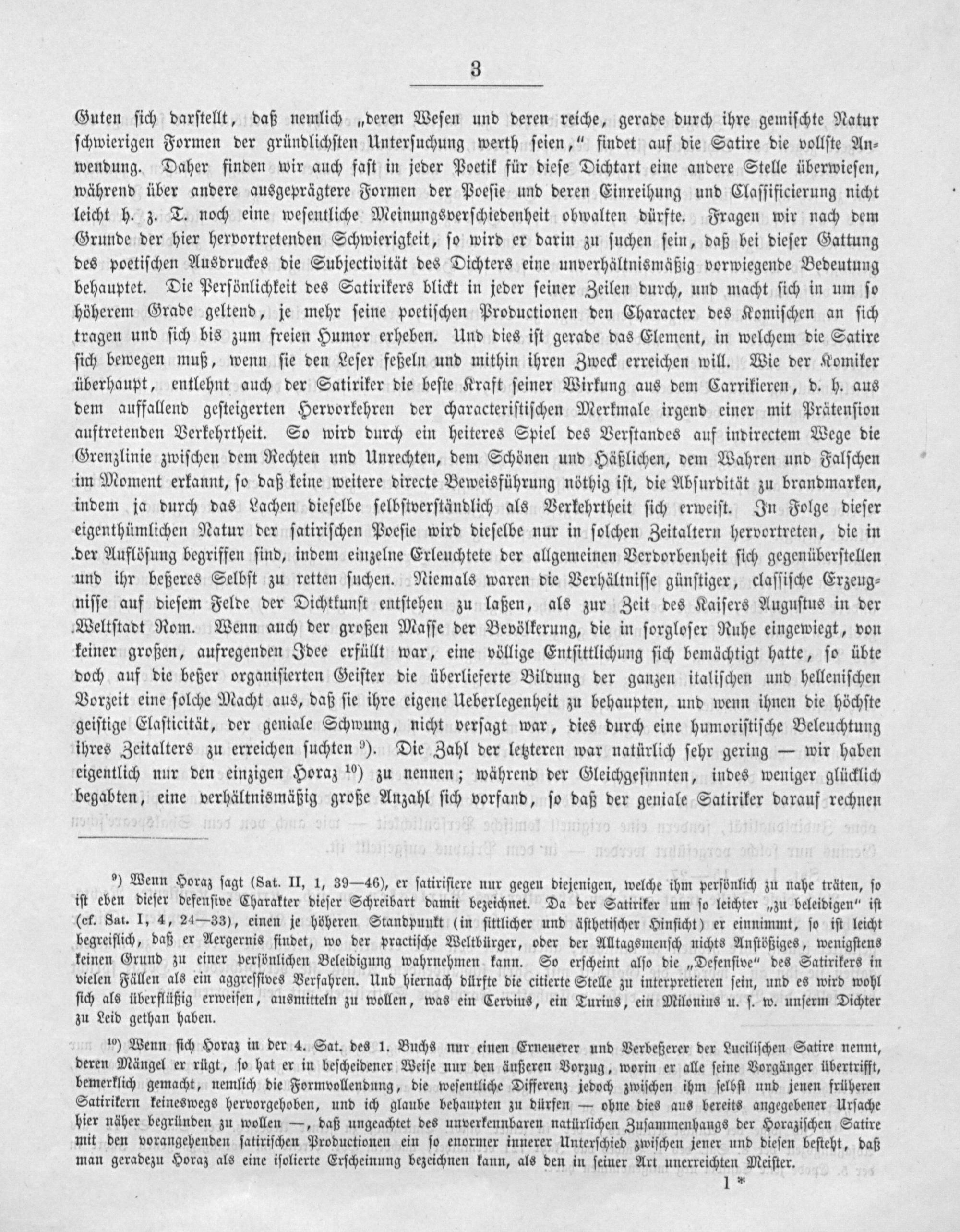 Guten ſich darſtellt, daß nemlich„deren Weſen und deren reiche, gerade durch ihre gemiſchte Natur ſchwierigen Formen der gründlichſten Unterſuchung werth ſeien,“ findet auf die Satire die vollſte An⸗ wendung. Daher finden wir auch faſt in jeder Poetik für dieſe Dichtart eine andere Stelle überwieſen, während über andere ausgeprägtere Formen der Poeſie und deren Einreihung und Claſſificierung nicht leicht h. z. T. noch eine weſentliche Meinungsverſchiedenheit obwalten dürfte. Fragen wir nach dem Grunde der hier hervortretenden Schwierigkeit, ſo wird er darin zu ſuchen ſein, daß bei dieſer Gattung des poetiſchen Ausdruckes die Subjectivität des Dichters eine unverhältnismäßig vorwiegende Bedeutung behauptet. Die Perſönlichkeit des Satirikers blickt in jeder ſeiner Zeilen durch, und macht ſich in um ſo höherem Grade geltend, je mehr ſeine poetiſchen Productionen den Character des Komiſchen an ſich tragen und ſich bis zum freien Humor erheben. Und dies iſt gerade das Element, in welchem die Satire ſich bewegen muß, wenn ſie den Leſer feßeln und mithin ihren Zweck erreichen will. Wie der Komiker überhaupt, entlehnt auch der Satiriker die beſte Kraft ſeiner Wirkung aus dem Carrikieren, d. h. aus dem auffallend geſteigerten Hervorkehren der characteriſtiſchen Merkmale irgend einer mit Prätenſion auftretenden Verkehrtheit. So wird durch ein heiteres Spiel des Verſtandes auf indirectem Wege die Grenzlinie zwiſchen dem Rechten und Unrechten, dem Schönen und Häßlichen, dem Wahren und Falſchen im Moment erkannt, ſo daß keine weitere directe Beweisführung nöthig iſt, die Abſurdität zu brandmarken, indem ja durch das Lachen dieſelbe ſelbſtverſtändlich als Verkehrtheit ſich erweiſt. In Folge dieſer eigenthümlichen Natur der ſatiriſchen Poeſie wird dieſelbe nur in ſolchen Zeitaltern hervortreten, die in der Auflöſung begriffen ſind, indem einzelne Erleuchtete der allgemeinen Verdorbenheit ſich gegenüberſtellen und ihr beßeres Selbſt zu retten ſuchen. Niemals waren die Verhältniſſe günſtiger, claſſiſche Erzeug⸗ niſſe auf dieſem Felde der Dichtkunſt entſtehen zu laßen, als zur Zeit des Kaiſers Auguſtus in der Weltſtadt Rom. Wenn auch der großen Maſſe der Bevölkerung, die in ſorgloſer Ruhe eingewiegt, von keiner großen, aufregenden Idee erfüllt war, eine völlige Entſittlichung ſich bemächtigt hatte, ſo übte doch auf die beßer organiſierten Geiſter die überlieferte Bildung der ganzen italiſchen und helleniſchen Vorzeit eine ſolche Macht aus, daß ſie ihre eigene Ueberlegenheit zu behaupten, und wenn ihnen die höchſte geiſtige Elaſticität, der geniale Schwung, nicht verſagt war, dies durch eine humoriſtiſche Beleuchtung ihres Zeitalters zu erreichen ſuchten»). Die Zahl der letzteren war natürlich ſehr gering— wir haben eigentlich nur den einzigen Horaz ¹⁰) zu nennen; während der Gleichgeſinnten, indes weniger glücklich begabten, eine verhältnismäßig große Anzahl ſich vorfand, ſo daß der geniale Satiriker darauf rechnen