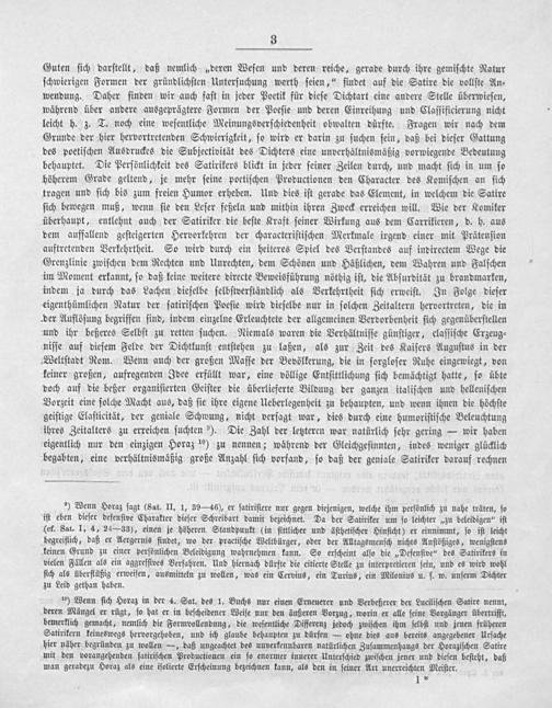¹⁰) Wenn ſich Horaz in der 4. Sat. des 1. Buchs nur einen Erneuerer und Verbeßerer der Luciliſchen Satire nennt, deren Mängel er rügt, ſo hat er in beſcheidener Weiſe nur den äußeren Vorzug, worin er alle ſeine Vorgänger übertrifft, bemerklich gemacht, nemlich die Formvollendung, die weſentliche Differenz jedoch zwiſchen ihm ſelbſt und jenen früheren Satirikern keineswegs hervorgehoben, und ich glaube behaupten zu dürfen— ohne dies aus bereits angegebener Urſache hier näher begründen zu wollen—, daß ungeachtet des unverkennbaren natürlichen Zuſammenhangs der Horaziſchen Satire mit den vorangehenden ſatiriſchen Productionen ein ſo enormer innerer Unterſchied zwiſchen jener und dieſen beſteht, daß man geradezu Horaz als eine iſolierte Erſcheinung bezeichnen kann, als den in ſeiner Art unerreichten Meiſter.