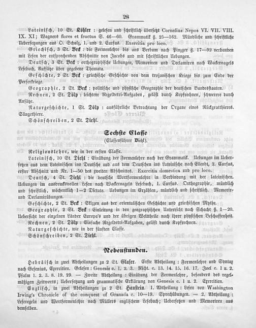 Deutſch, 4 St. Diehl: die deutſche Wortformenlehre in Verbindung mit der lateiniſchen. Uebungen im ausdrucksvollen Leſen nach Wackernagels Leſebuch, 1. Curſus. Orthographie, mündlich und ſchriftlich, wöchentlich 1—2 Dictate. Uebungen im Erzählen, mündlich und ſchriftlich. Memorir⸗ und Declamirübungen.