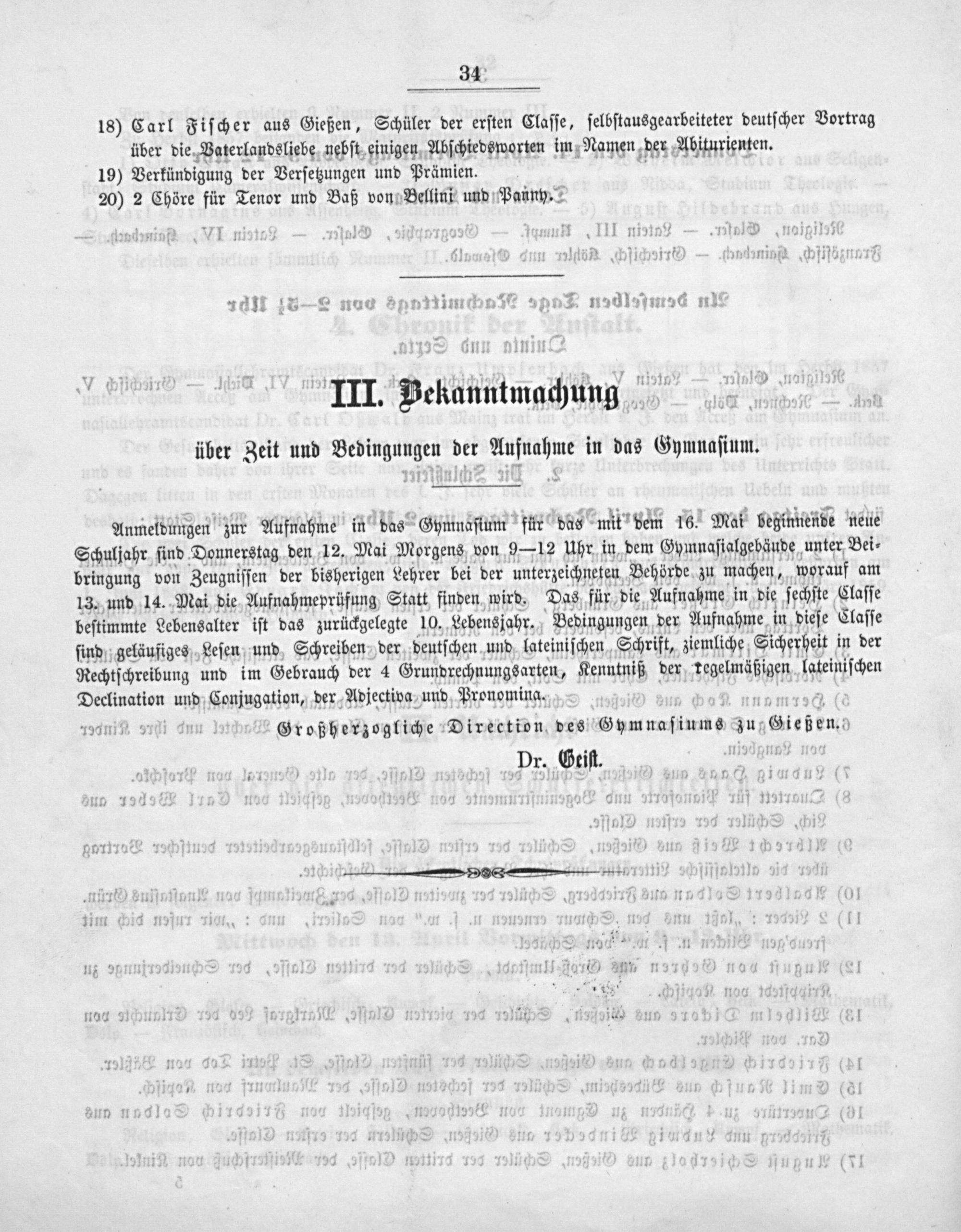 18) Carl Fiſcher aus Gießen, Schüler der erſten Claſſe, ſelbſtausgearbeiteter deutſcher Vortrag über die Vaterlandsliebe nebſt einigen Abſchiedsworten im Namen der Abiturienten.
