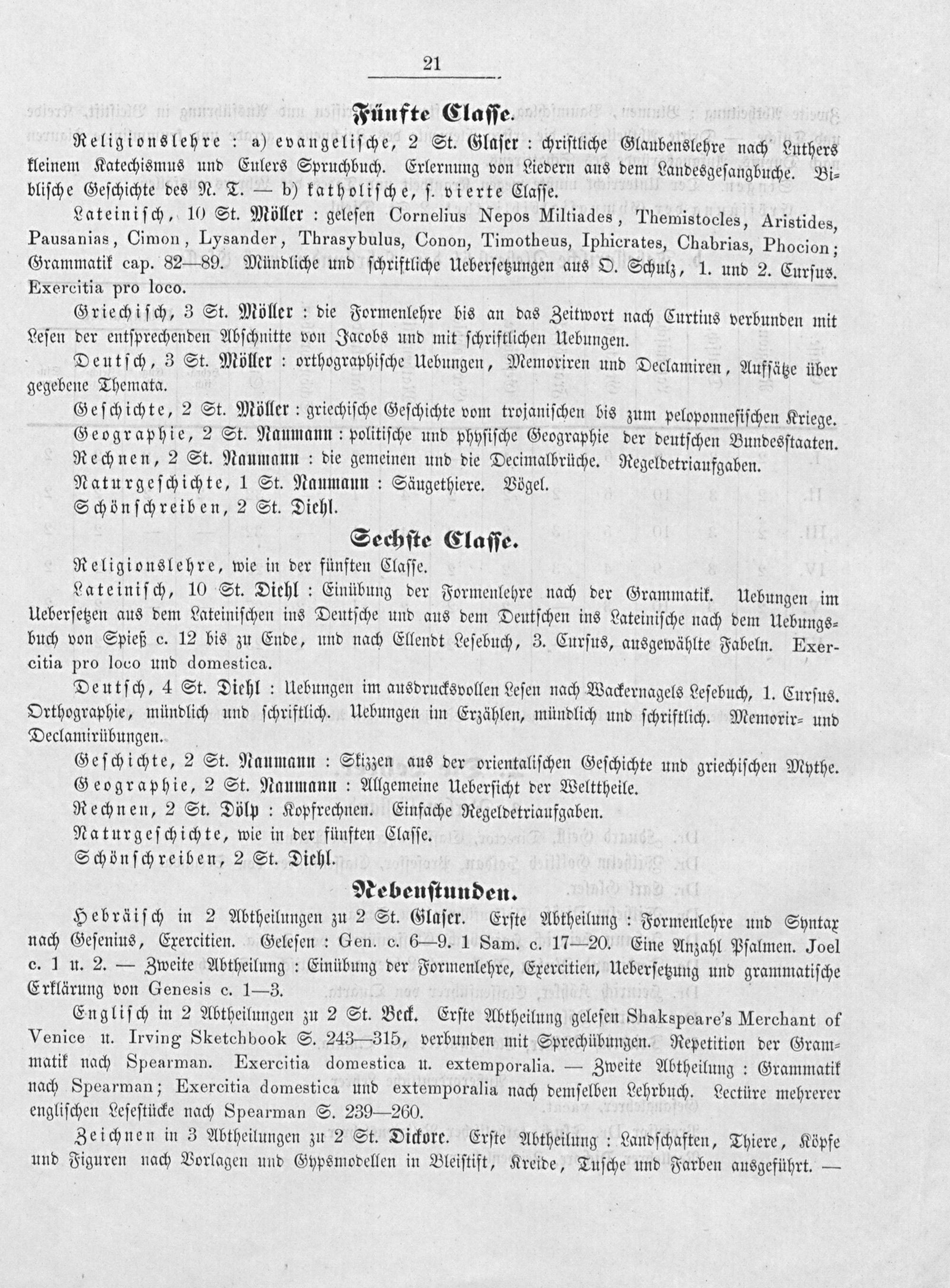 Hebräiſch in 2 Abtheilungen zu 2 St. Glaſer. Erſte Abtheilung: Formenlehre und Syntax nach Geſenius, Exercitien. Geleſen: Gen. c. 6— 9. 1 Sam. c. 17— 20. Eine Anzahl Pſalmen. Joel c. 1 u. 2.— Zweite Abtheilung: Einübung der Formenlehre, Exercitien, Ueberſetzung und grammatiſche Erklärung von Genesis c. 1—3.