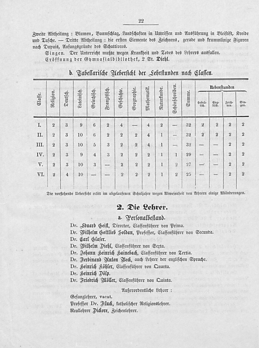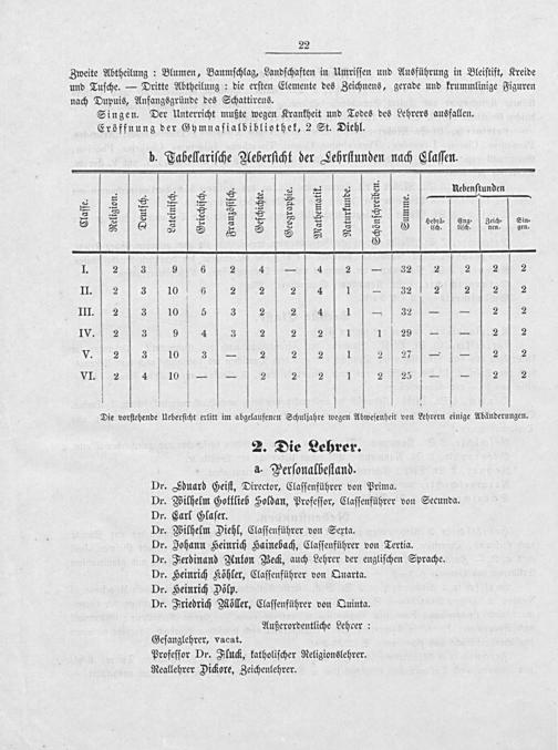 a. Verſonalbeſtand. Dr. duard Geiſt, Director, Claſſenführer von Prima. Dr. Wilhelm Gottlieb Soldan, Profeſſor, Claſſenführer von Secunda. Dr. Carl Glaſer. Dr. Wilhelm Diehl, Claſſenführer von Sexta. Dr. Johann Heinrich Hainebach, Claſſenführer von Tertia. Dr. Ferdinand Anton Beck, auch Lehrer der engliſchen Semoe Dr. Heinrich Köhler, Claſſenführer von Quarta. Dr. Heinrich Dölp. Dr. Friedrich Möller, Claſſenführer von Quinta.