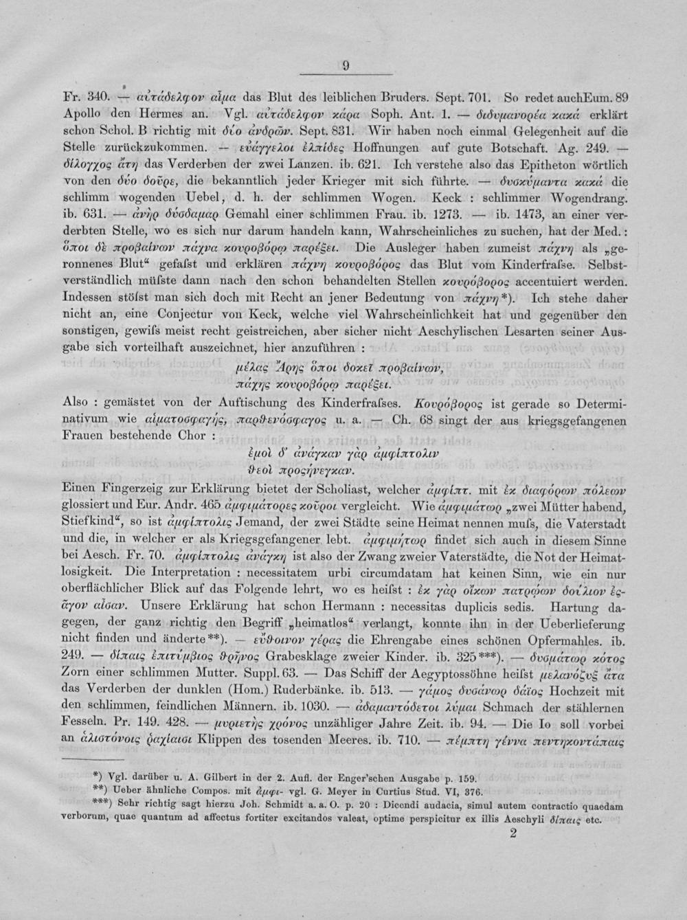 Einen Fingerzeig zur Erklärung bietet der Scholiast, welcher μααͥæτ. mit àxα 6εαασν ꝙσπευν glossiert und Eur. Andr. 465.μασ⁴αιοοες ααανοοο vergleicht. Wie dαναασαμ⁴ιαο„Zzwei Mütter habend, Stiefkind“, so ist dαμααραρταιοαςι Jemand, der zwei Städte seine Heimat nennen mulſs, die Vaterstadt und die, in welcher er als Kriegsgefangener lebt. dιαο findet sich auch in diesem Sinne bei Aesch. Fr. 70. όσφάφάοειςι ννακ ist also der Zwang zweier Vaterstädte, die Not der Heimat- losigkeit. Die Interpretation: necessitatem urbi circumdatam hat keinen Sinn, wie ein nur oberflächlicher Blick auf das Folgende lehrt, wo es heiſst: à&ςα„αeο lπααυν πααάτορσν dονον ε- cyον αoα. Unsere Erklärung hat schon Hermann: necessitas duplicis sedis. Hartung da- gegen, der ganz richtig den Begriff„heimatlos“ verlangt, konnte ihn in der Ueberlieferung nicht finden und änderte**).— e590νον„εοας die Ehrengabe eines schönen Opfermahles. ib. 249.— diaα&xατννειααοσι ϑωm⁷mοο Grabesklage zweier Kinder. ib. 325***).— Gυα⁴εο m το⁹ς Zorn einer schlimmen Mutter. Suppl. 63.— Das Schiff der Aegyptossöhne heilst uεᷣνεvs dra das Verderben der dunklen(Hom.) Ruderbänke. ib. 513.—„Aχ dυισαιαο ⁴οo Hochzeit mit den schlimmen, feindlichen Männern. ib. 1030.— ddauανεε⁶εοι ευ⁵α Schmach der stählernen Fesseln. Pr. 149. 428.— 1υο οιτι⁹ς Qο unzähliger Jahre Zeit. ib. 94.— Die Io soll vorbei an&ιστ⁶ιeνοσςι ανααο Klippen des tosenden Meeres. ib. 710.— ẽ,αμσπσι έ‿̈svνe evrixovrdats
